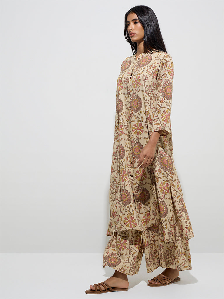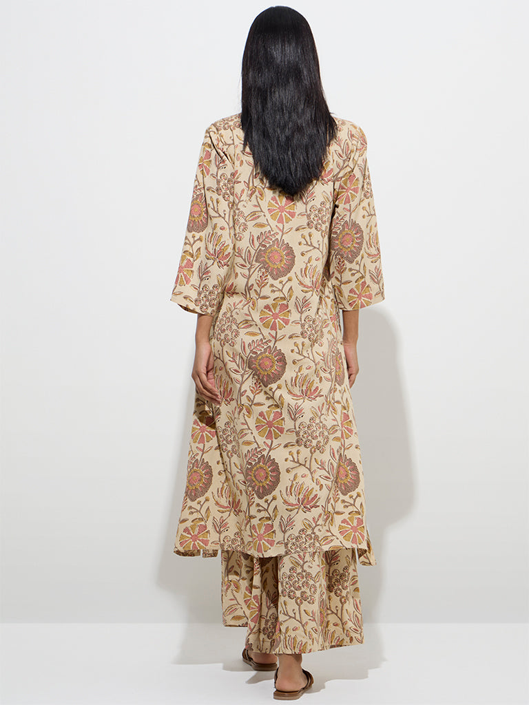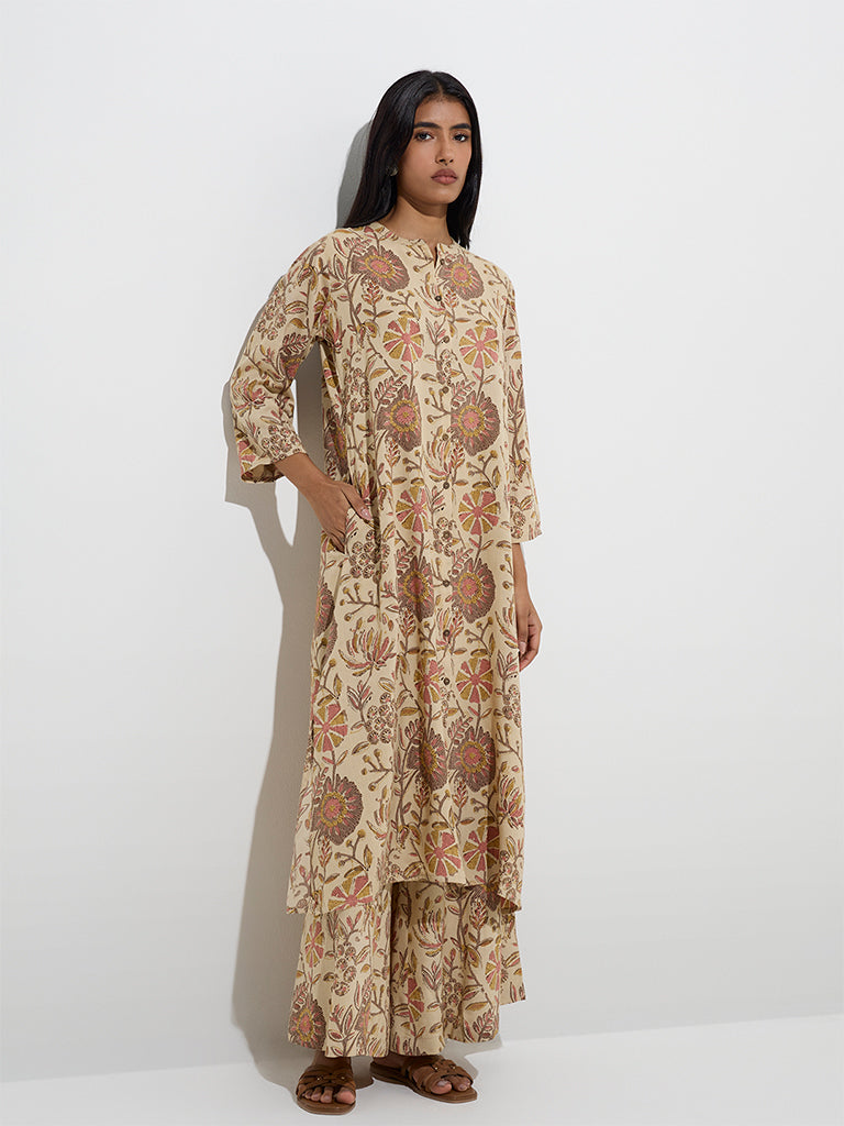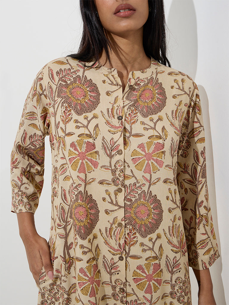 This beige A-line kurta from Utsa features a graceful floral print that adds a touch of elegance to your wardrobe. Crafted from quality fabric. it is styled with a band collar. button-down front. full sleeves. and a practical side pocket for added convenience.