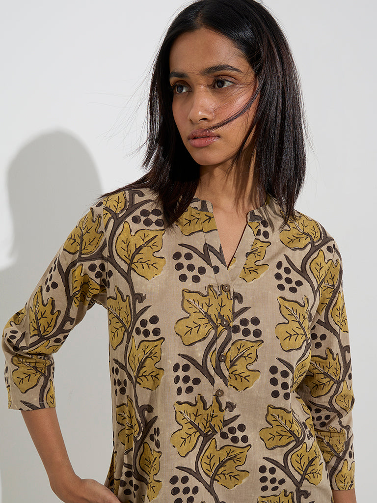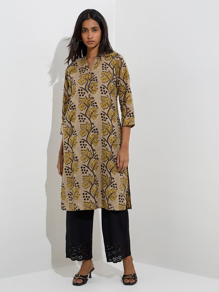 Utsa Beige Foliage Printed Straight Cotton Kurta