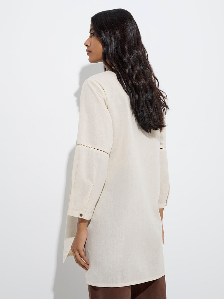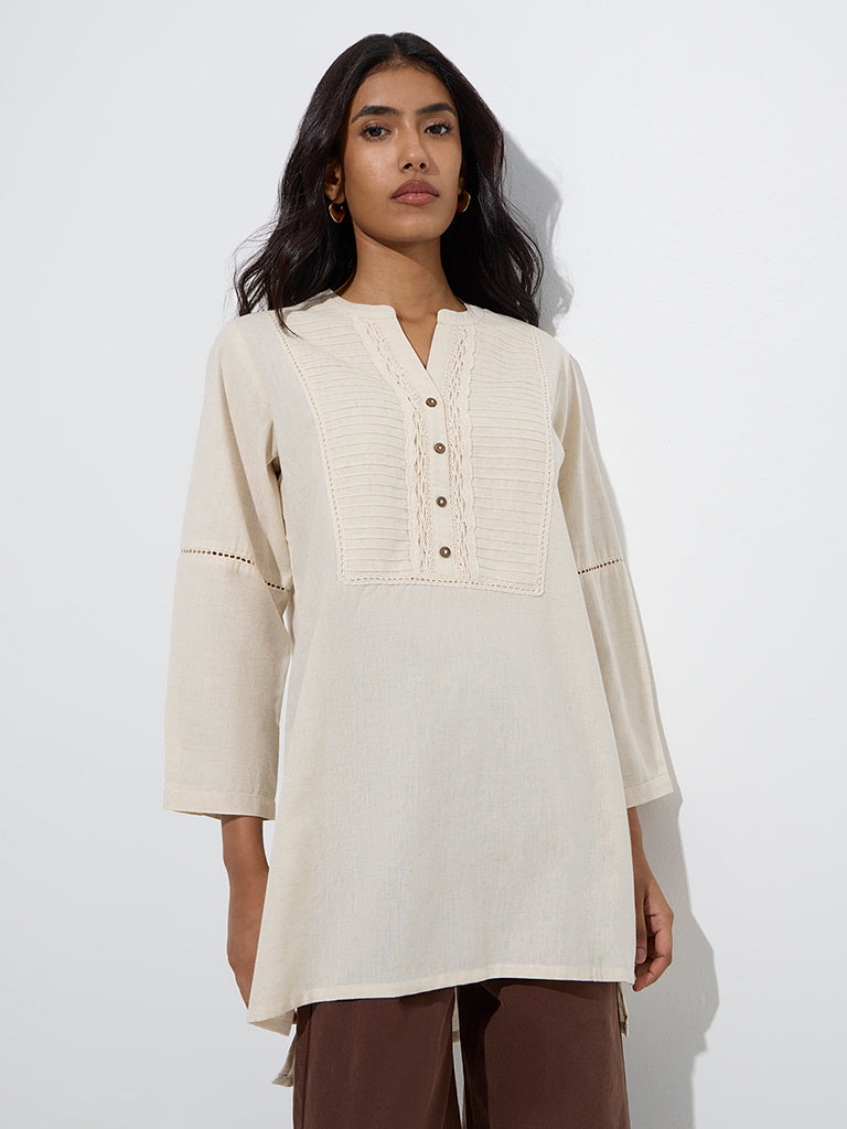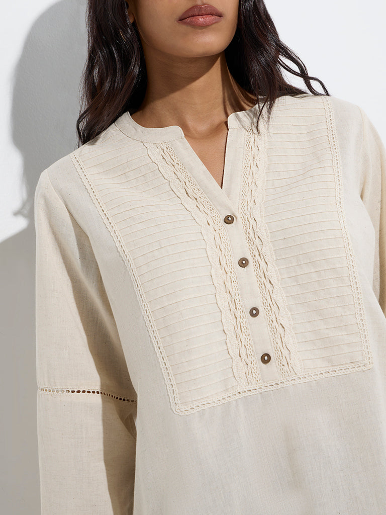 This beige tunic from Utsa is woven from a premium cotton-linen blend. offering all-day comfort with a refined touch. Accented with pintuck detailing and subtle crochet trims at the yoke. it features a mandarin neck with a short button placket and three-quarter sleeves for an effortlessly elegant finish.