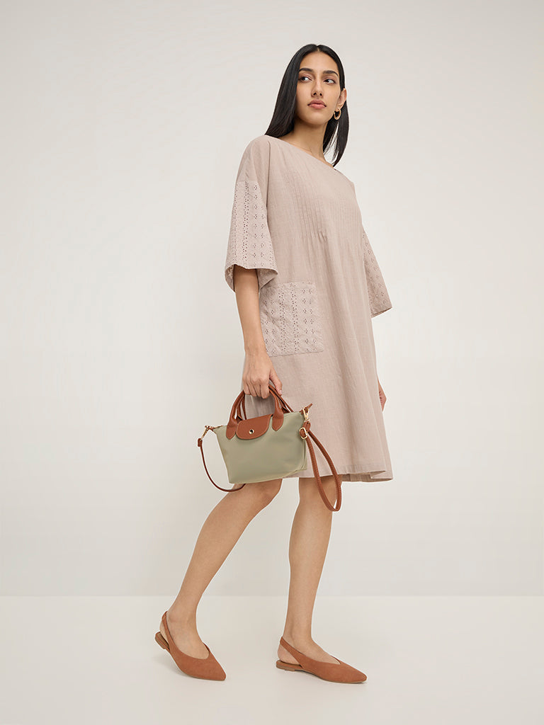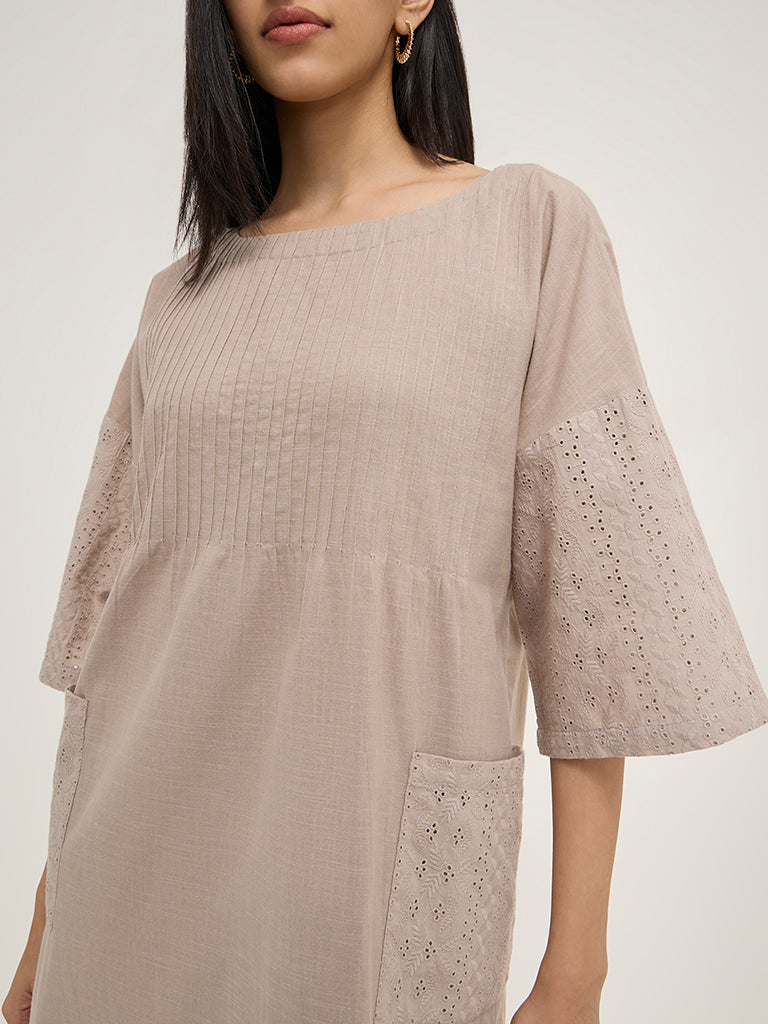 Utsa Beige Schiffli Design Cotton A-Line Dress