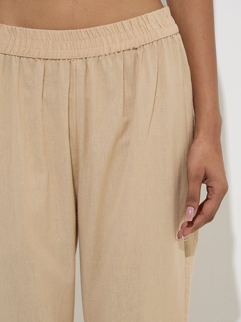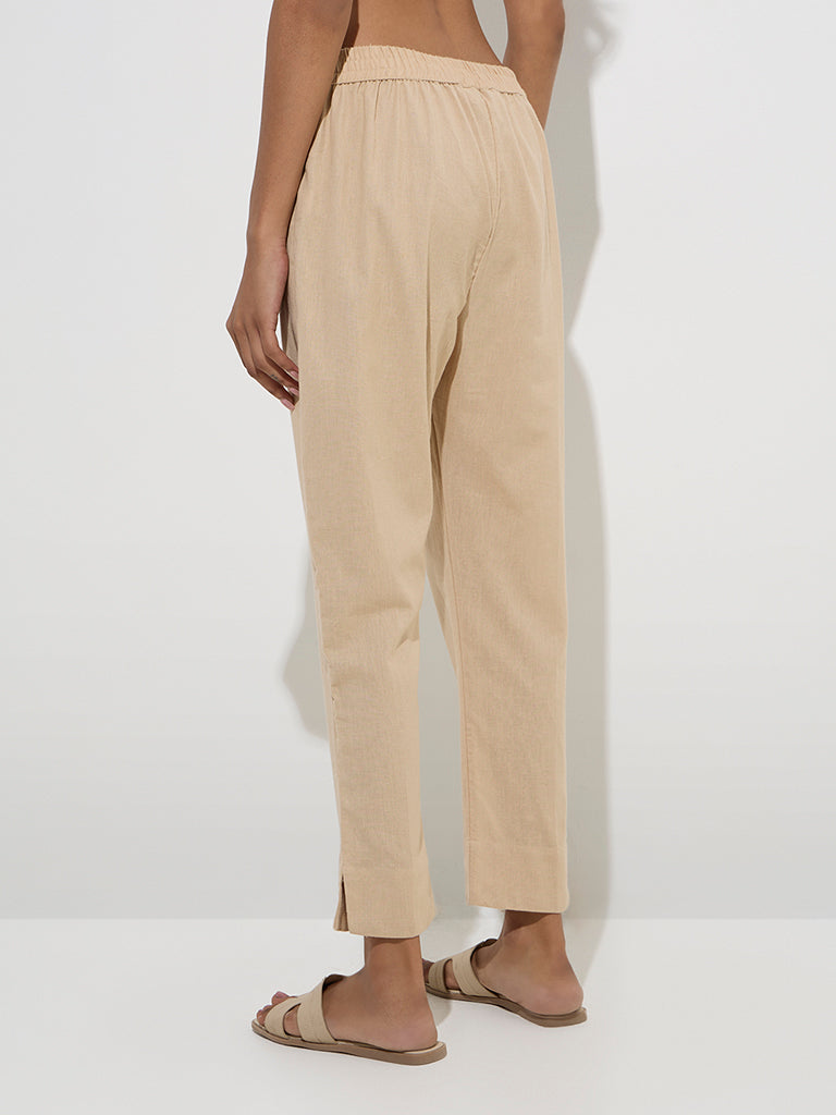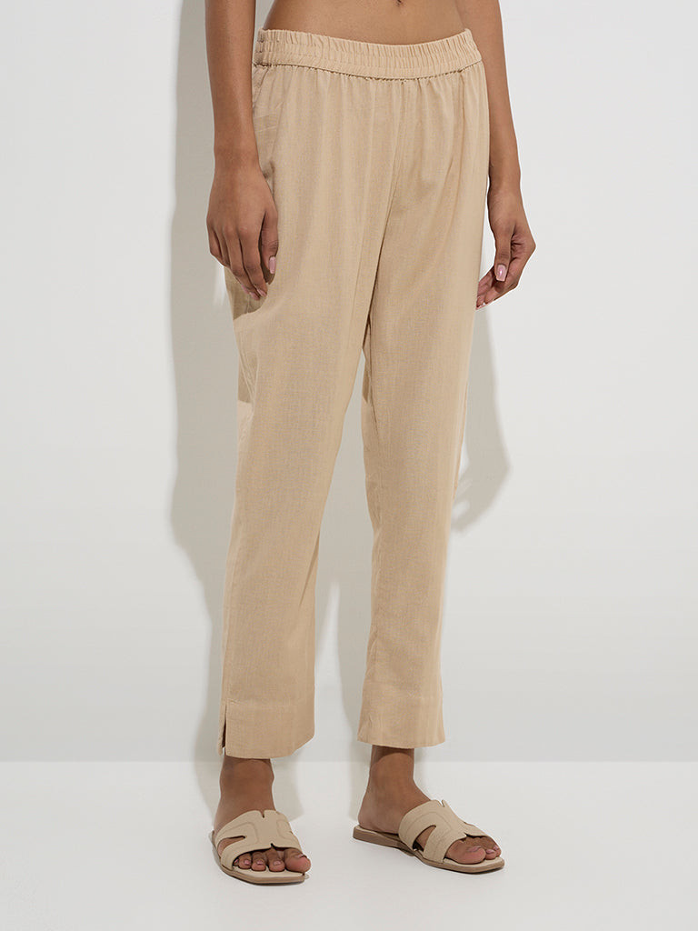 Utsa Beige Solid Cotton Ethnic Pants