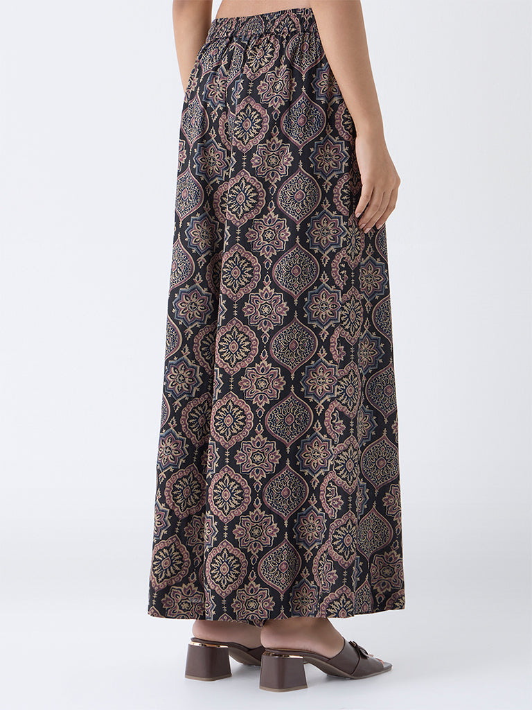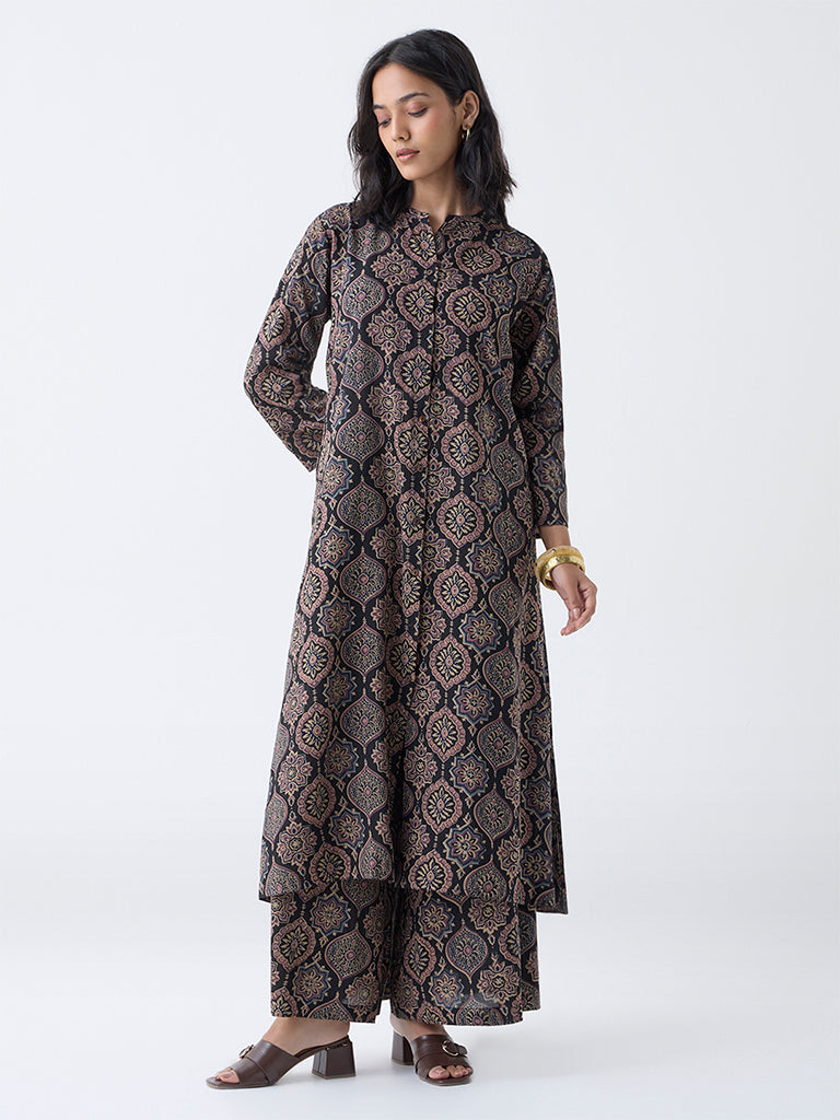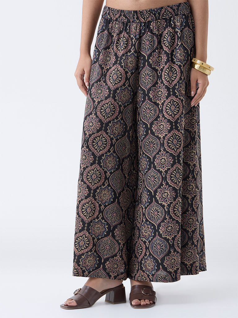 Effortlessly stylish. these black palazzos from Utsa are adorned with subtle argyle motifs for a coordinated look. The elasticated waistband with drawstring ensures a comfortable fit. while the relaxed silhouette moves with you. Pair them with the matching kurta or a contrasting solid top for a refined. festive finish.