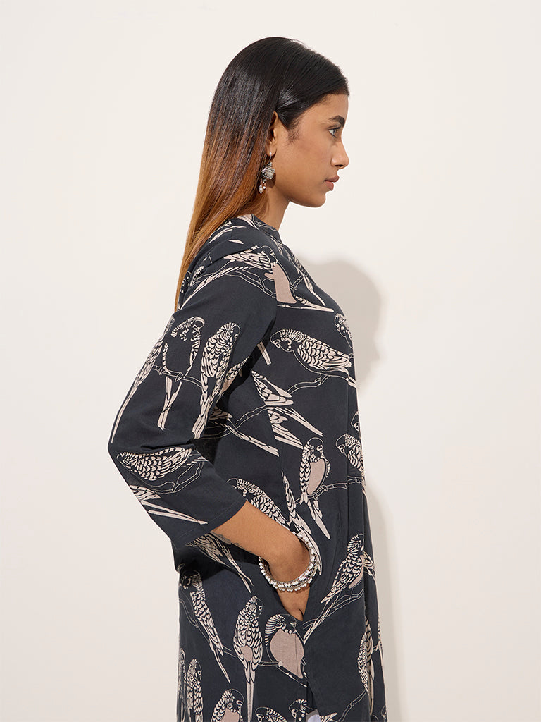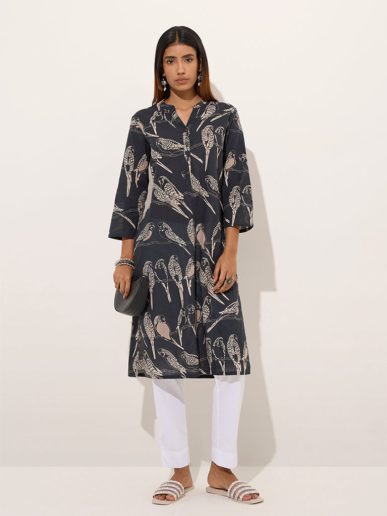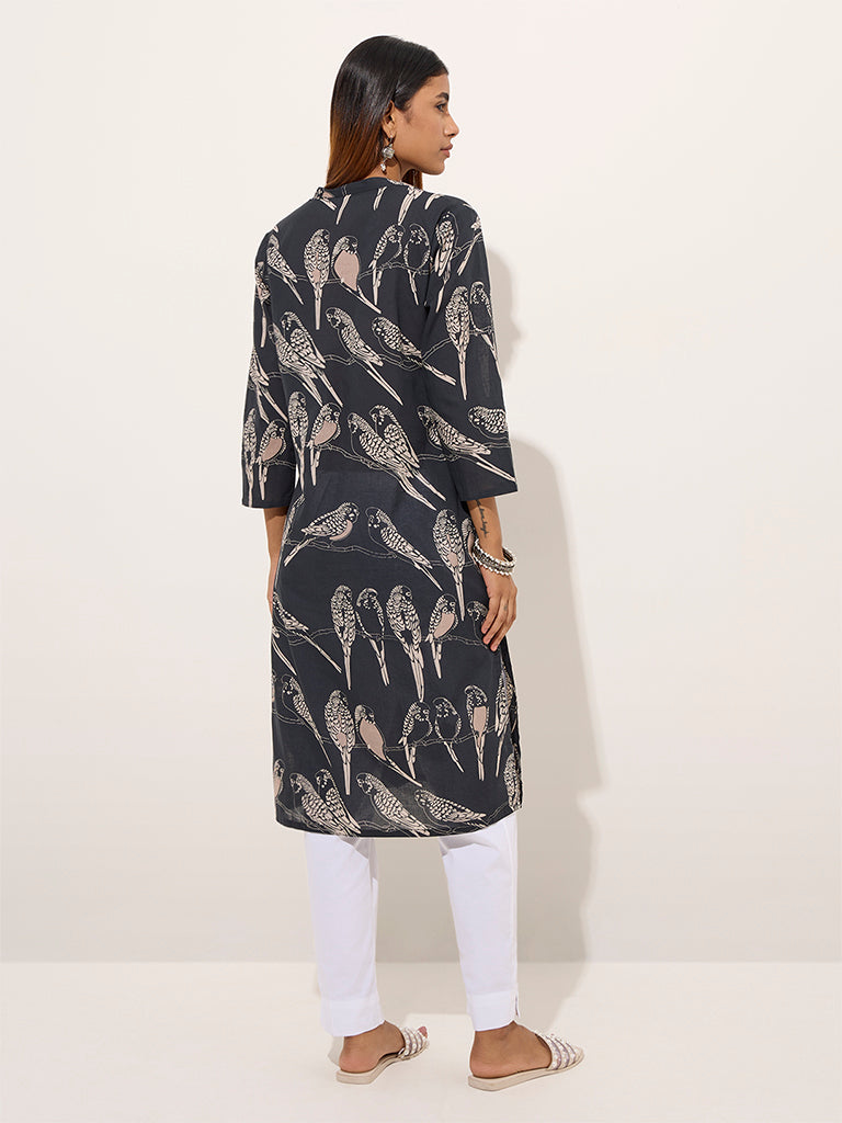 This black kurta by Utsa features elegant parrot prints. The pure cotton ethnic wear offers a stylish straight silhouette. It is completed with a mandarin collar leading to a four button placket. three-fourth sleeves and a one sided pocket.