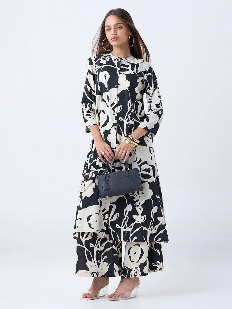 Bring a polished ease to your daily wardrobe with this black kurta from Utsa. Crafted with a graceful A-line silhouette. it’s elevated by a delicate botanical print that adds refined charm. The band-neck collar and button placket lend a structured finish. while 3/4 sleeves and handy side pockets balance style with everyday practicality.
