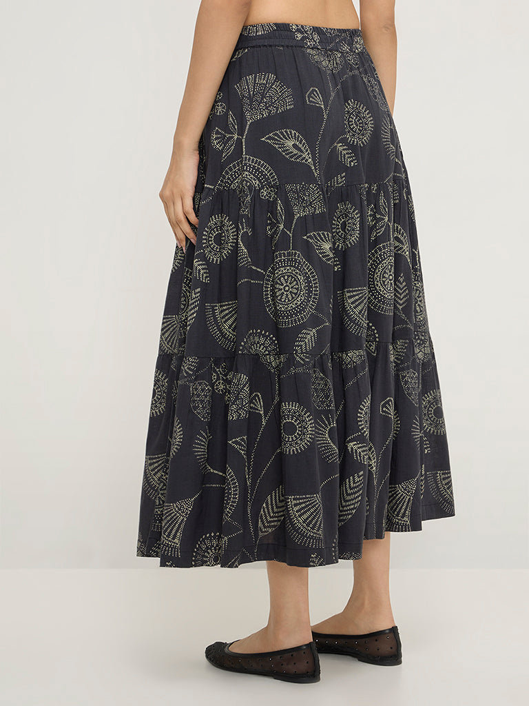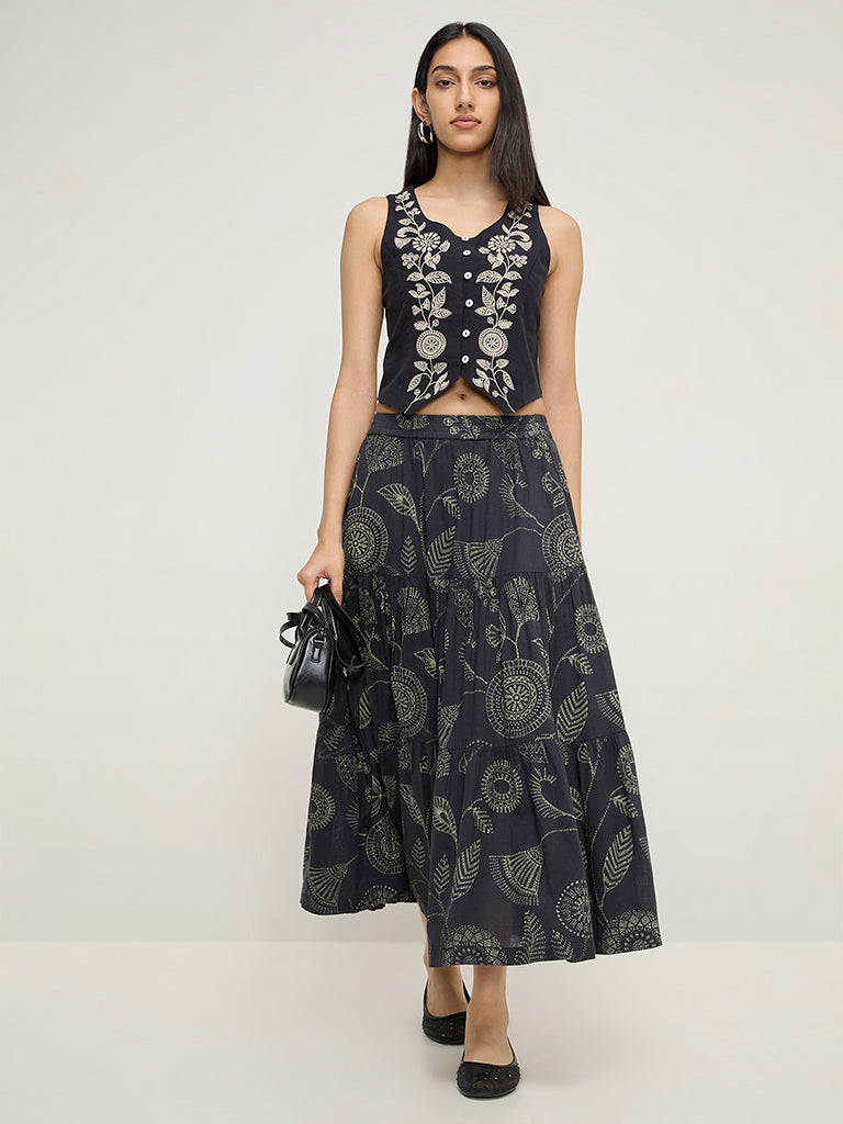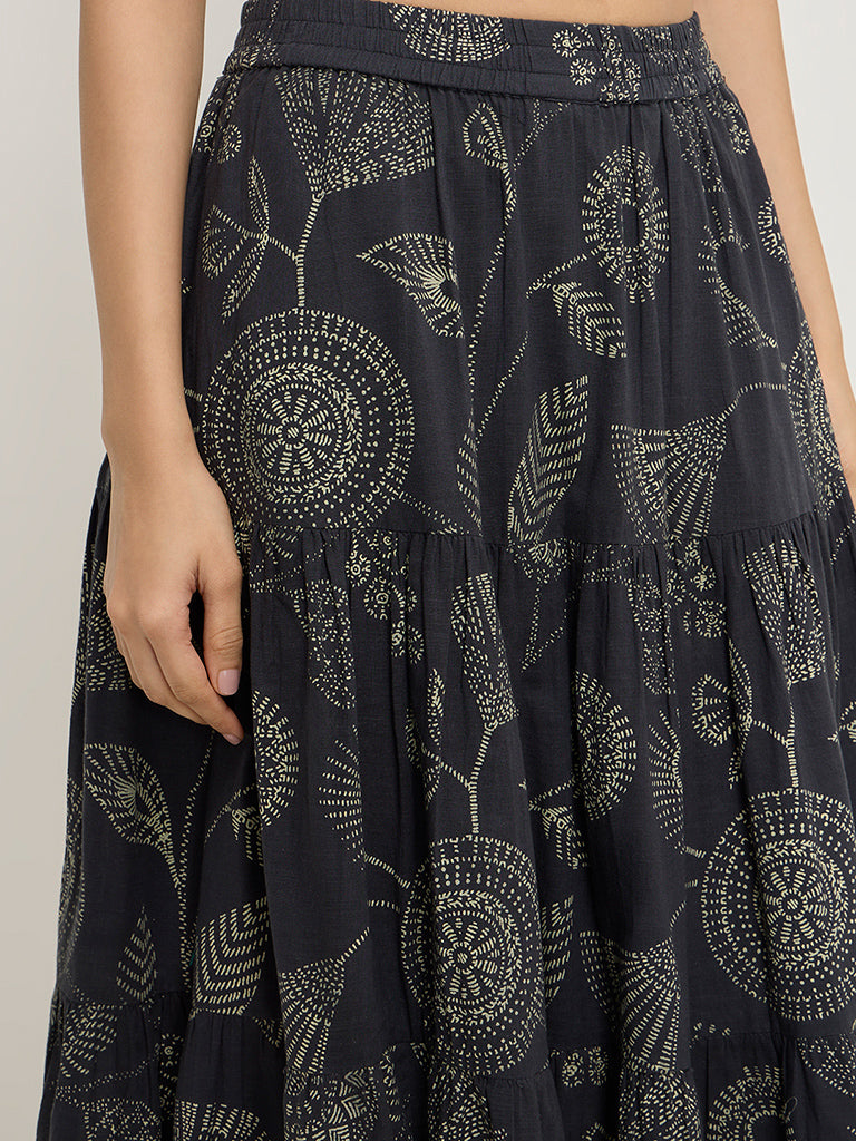 Fashioned in a tiered frame. this black skirt from Utsa flaunts botanical prints. It is designed with a high-rise fit from a lightweight fabric and is fitted with an elasticated waistband for a customised fit.