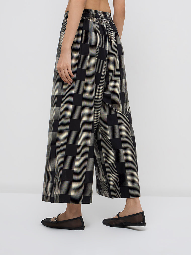 Utsa Black Checkered Mid-Rise Cotton Palazzos