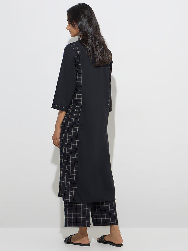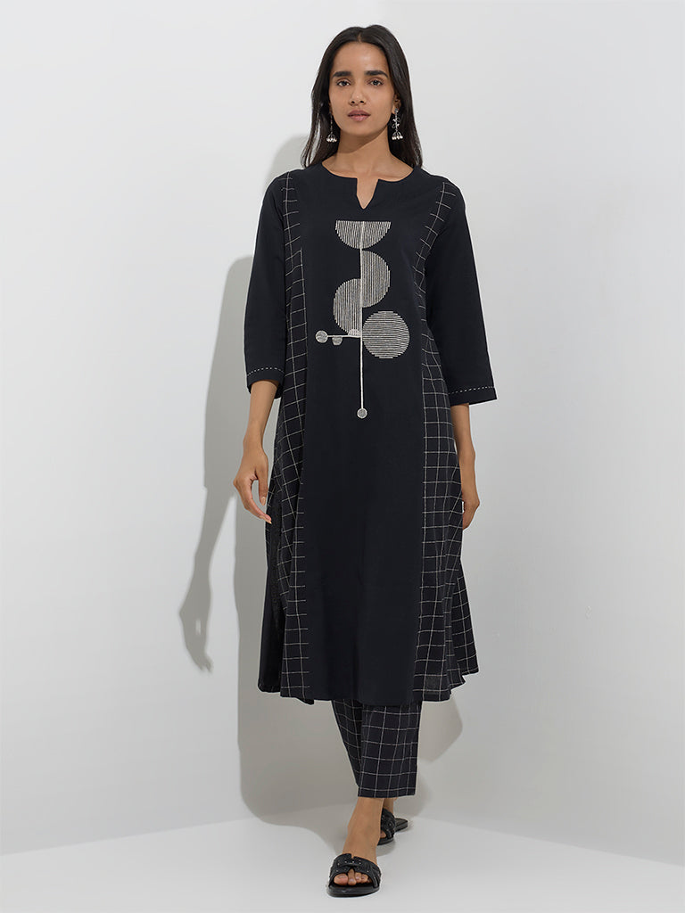 Utsa Black Checks Design A-Line Cotton-Blend Kurta