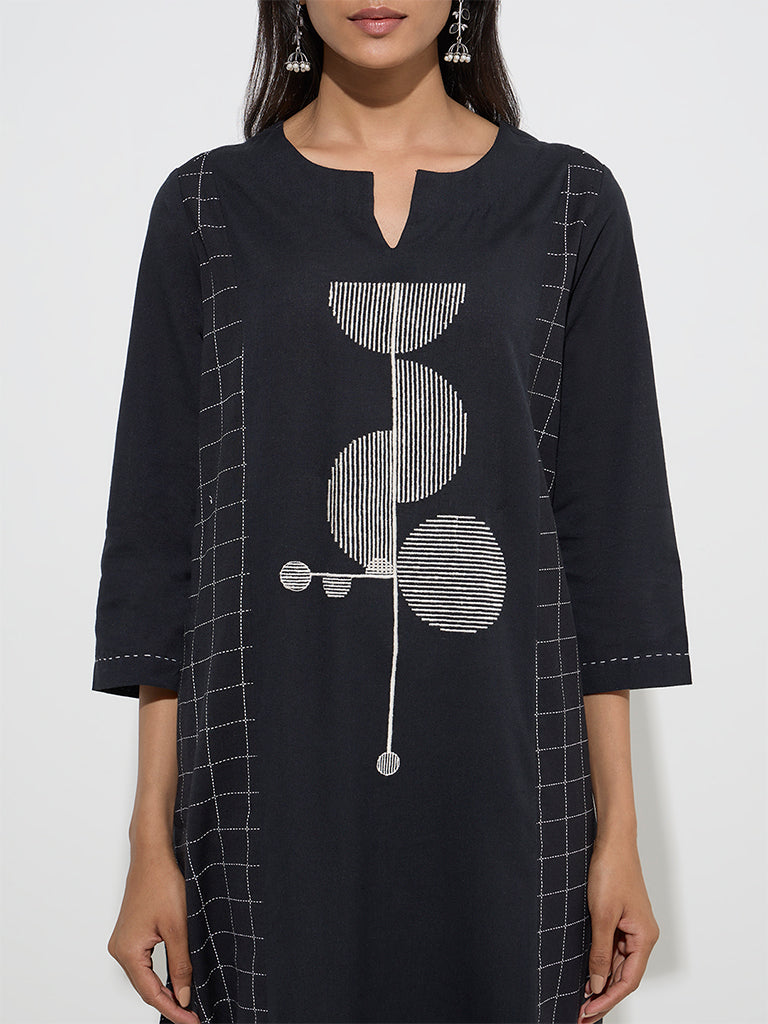 This black kurta from Utsa showcases a checkered print. thoughtfully offset by geometric motifs at the front for a contemporary twist. Constructed from a premium cotton-linen blend. it features a split neckline. three-quarter sleeves. and a handy slip pocket for everyday ease.
