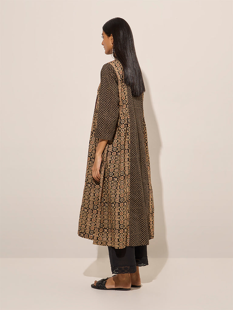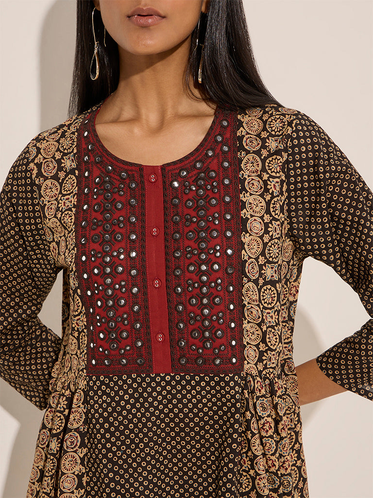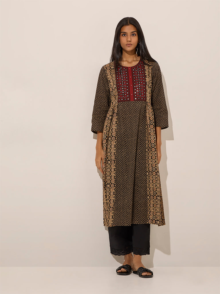 Utsa presents this black kurta designed with multiple prints and embellished bodice. Craved in an A-line silhouette. the pure cotton ethnic wear carries a round neck and full sleeves.