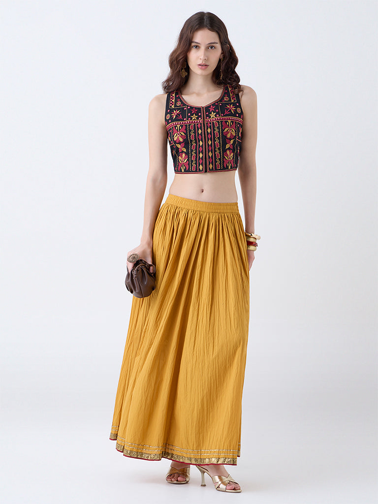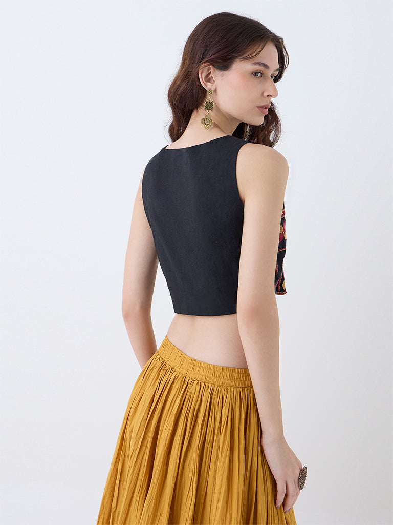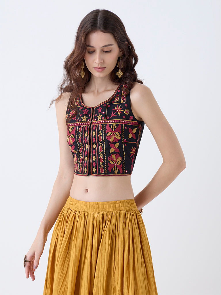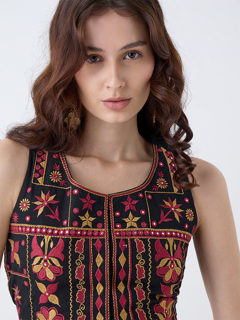 Reimagine layering with this black top from Utsa. Milled from breathable fabric. it highlights intricate embroidery at the front for a bold interplay of tradition and contemporary style. Designed with a round neck and a sleeveless silhouette. it layers effortlessly over your favourite kurta or top.