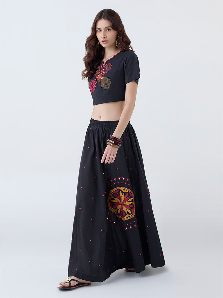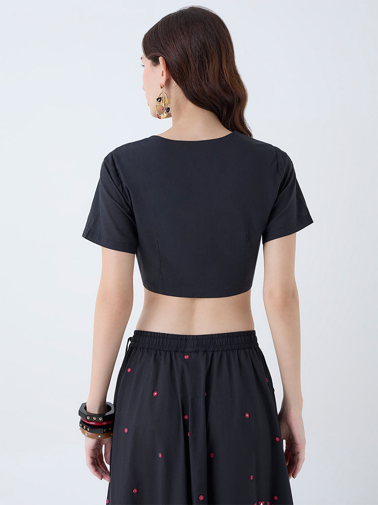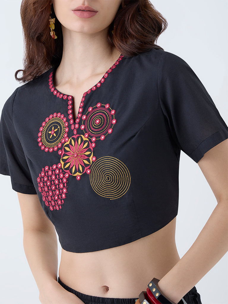 Let your outfit do the talking with this black ethnic top from Utsa. where intricate embroidery turns a classic silhouette into a statement piece. Woven from a luxurious fabric. it drapes effortlessly while offering all-day comfort. A split-neck and short sleeves lend a contemporary edge. making this top perfect for layering or wearing solo.