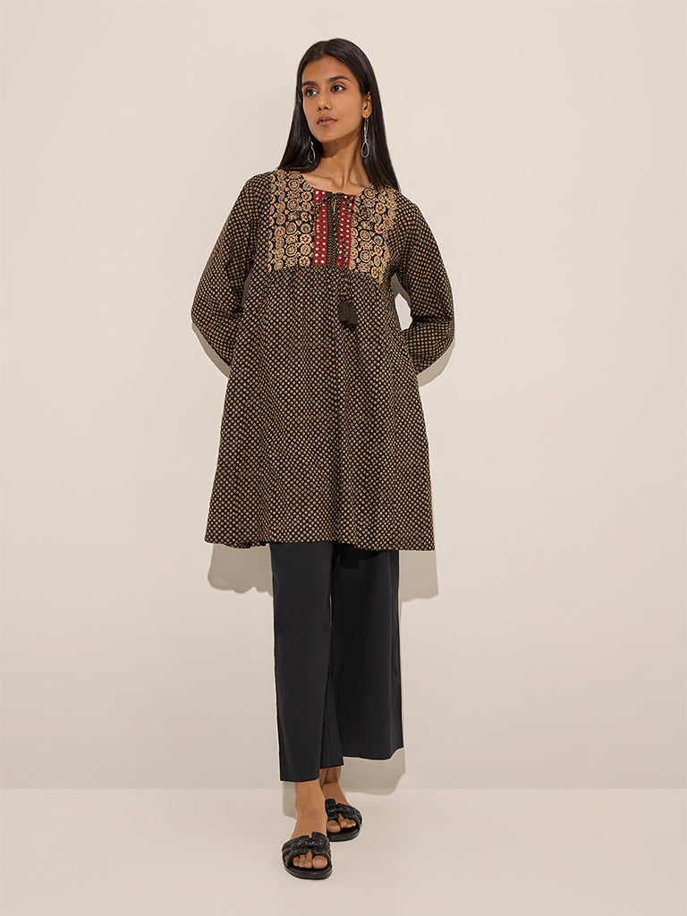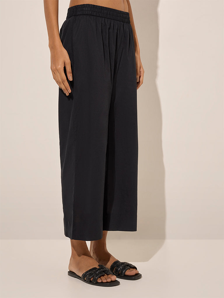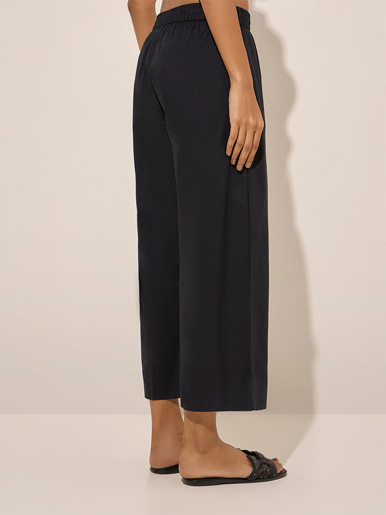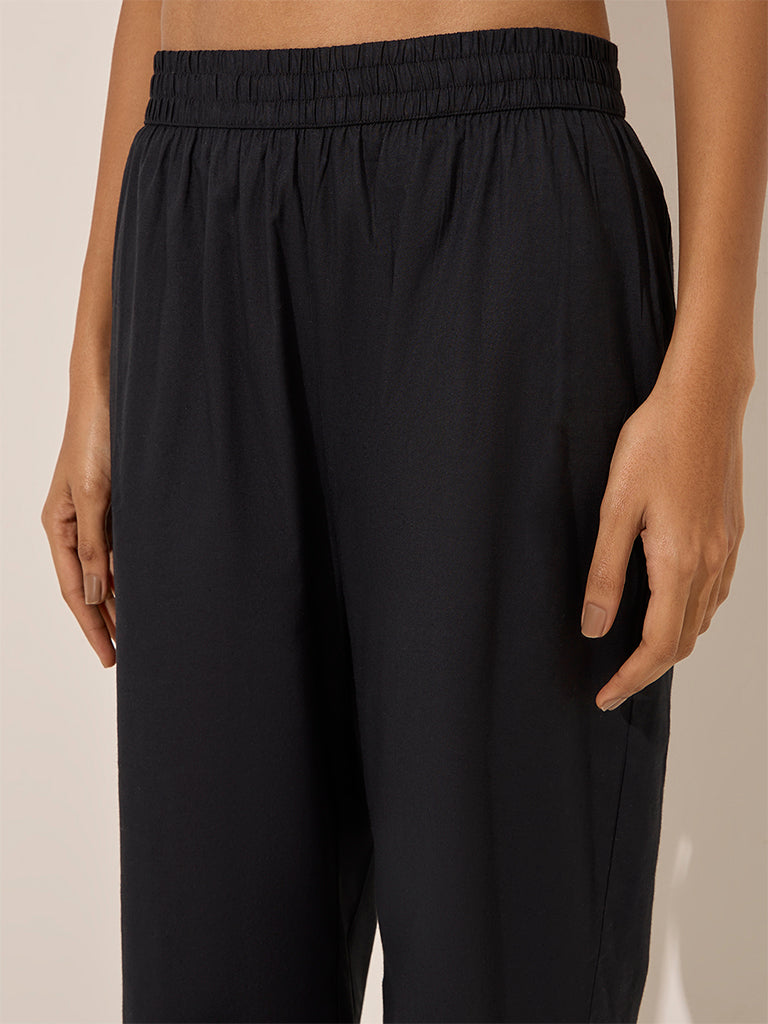 These black ethnic pants by Utsa are crafted from breathable fabric. The high-rise bottom wear comforts with its smooth elastic waistband.