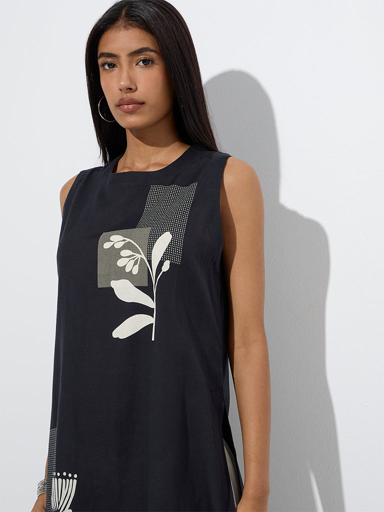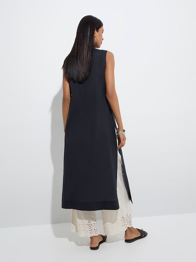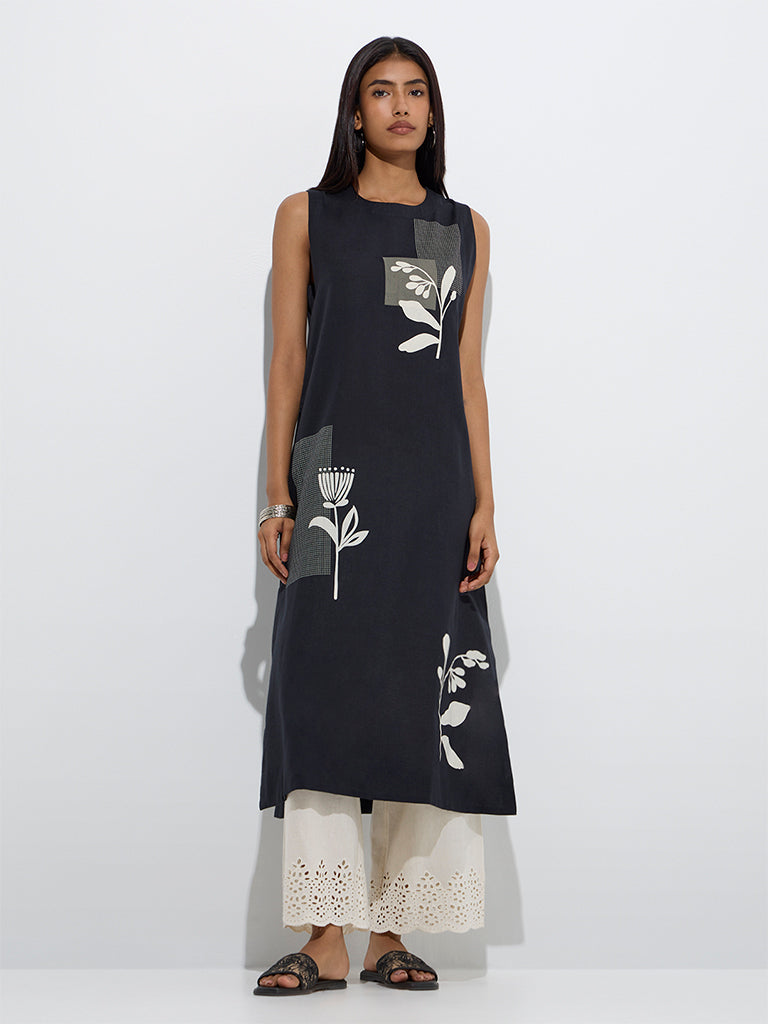 This black kurta from Utsa is decked with elegant floral prints for a refined look. Made from a sumptuous cotton-linen blend in an A-Line frame. it features a round neck and a sleeveless cut for a breezy finish.