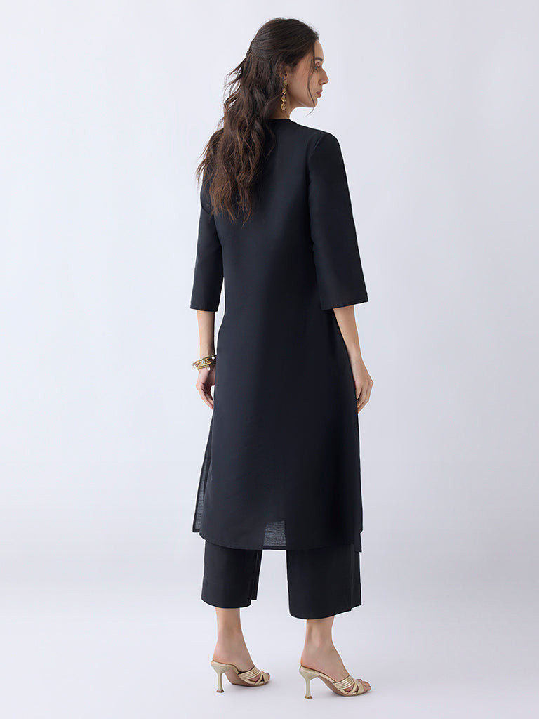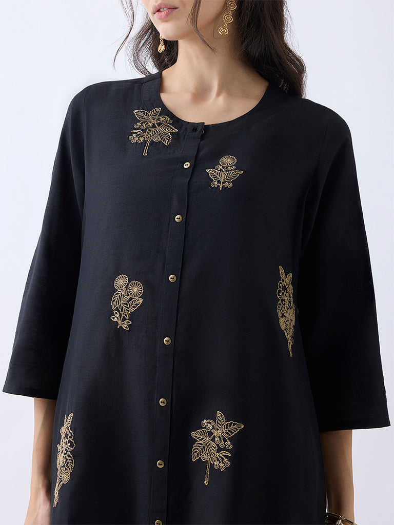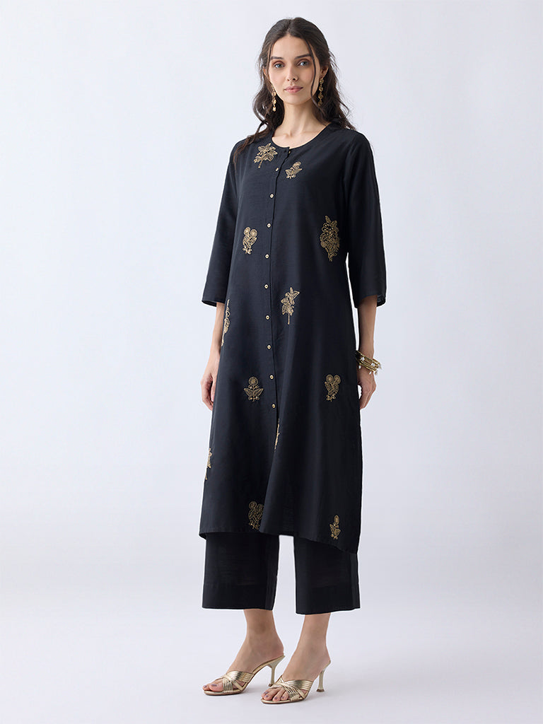 This black kurta from Utsa is designed in an A-line form. framed with a round neck. a button-up front and three-quarter sleeves. Showcasing floral embroidered motifs on a soft. breathable fabric. this staple piece seamlessly blends everyday casual and ethnic styling.