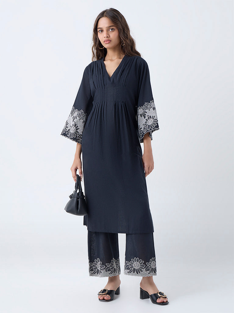 Utsa Black Floral Embroidered Cotton-Blend Pants