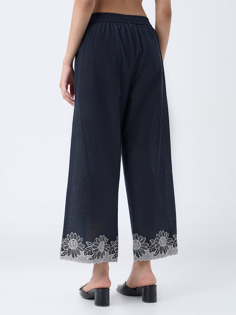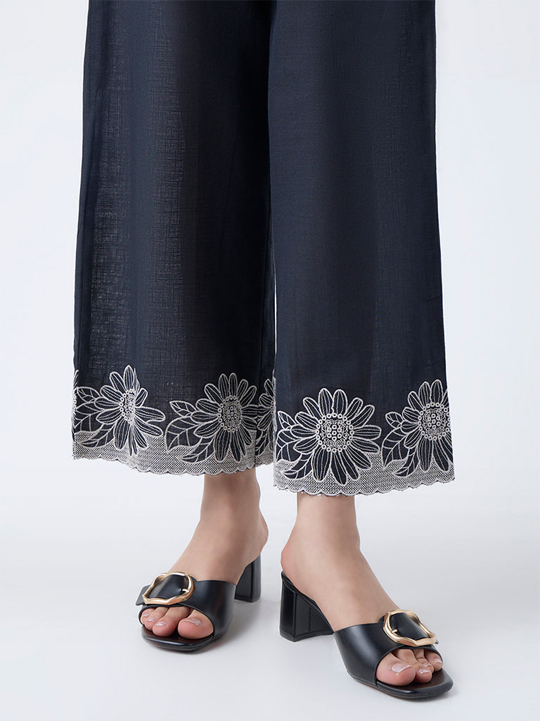 Utsa presents these black high-rise cotton-linen ethnic pants. featuring delicate floral embroidery along the hem for a touch of elegance. Designed with a smooth elastic waistband. they offer a comfortable fit and a stylish foundation for pairing with kurtas and tunics.