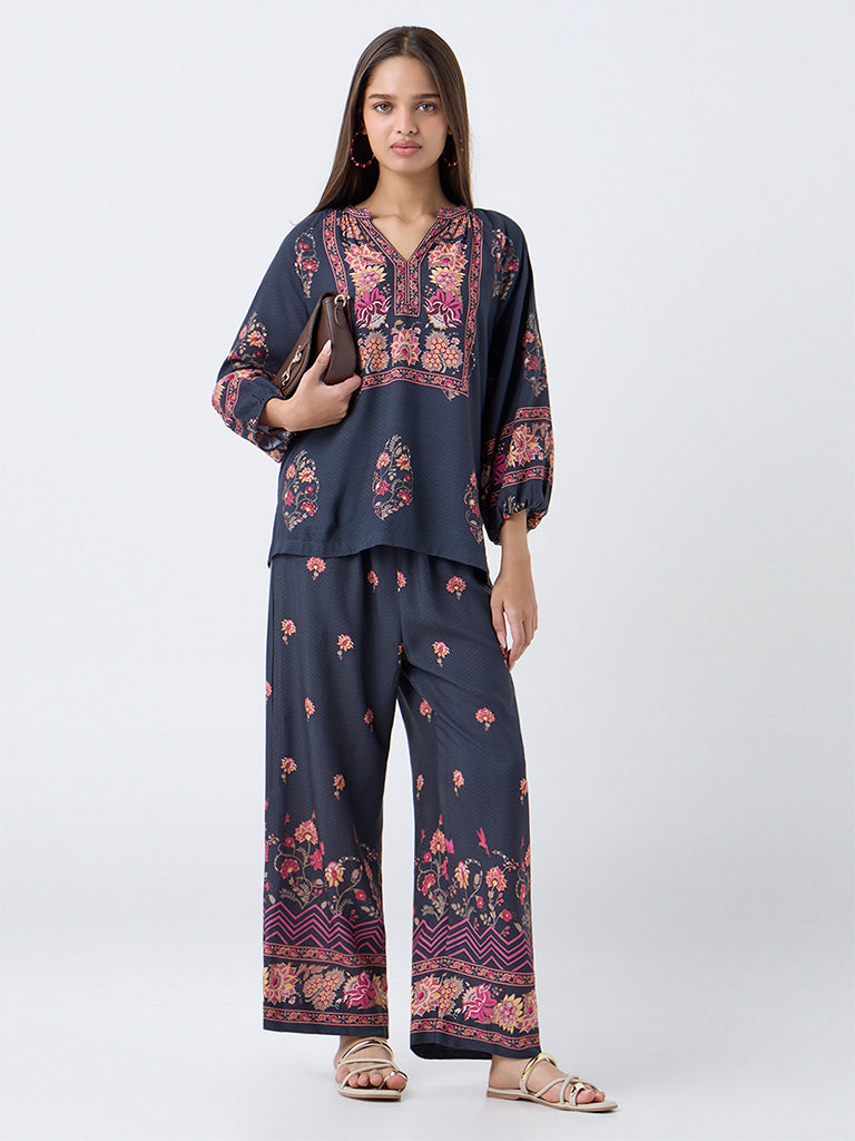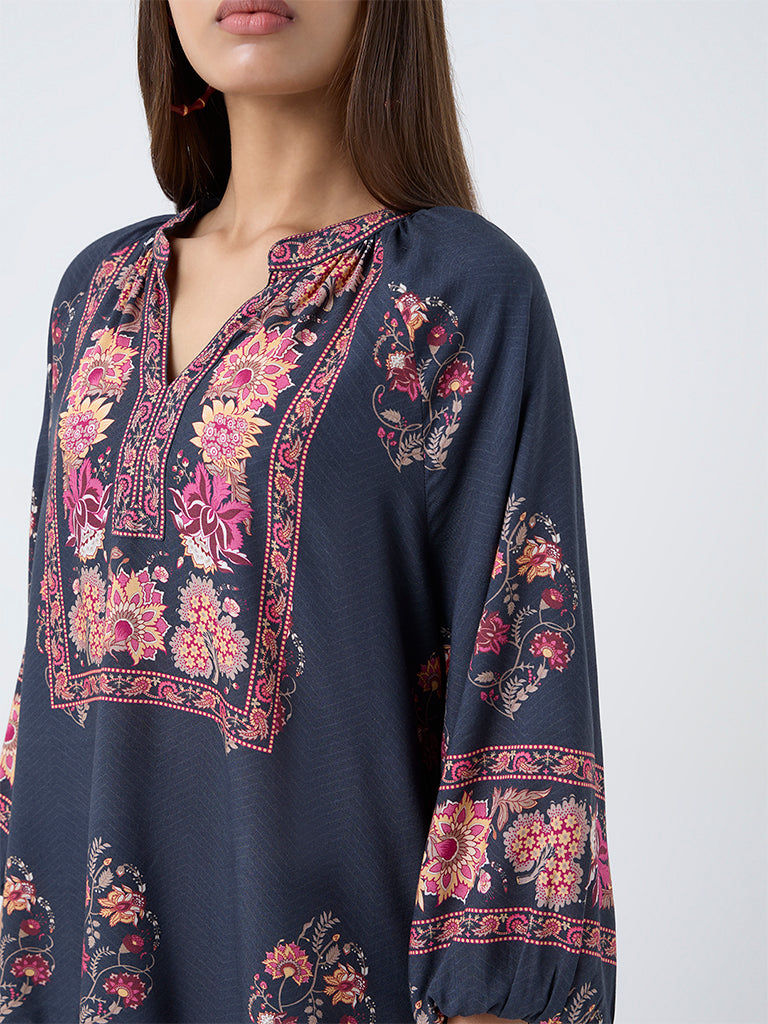 This black tunic from Utsa features floral motifs that lend it a touch of charm. Made from breathable fabric. it’s styled with a mandarin neckline and airy balloon sleeves for a relaxed. flattering drape. The kind of piece that moves easily from casual mornings to festive evenings.