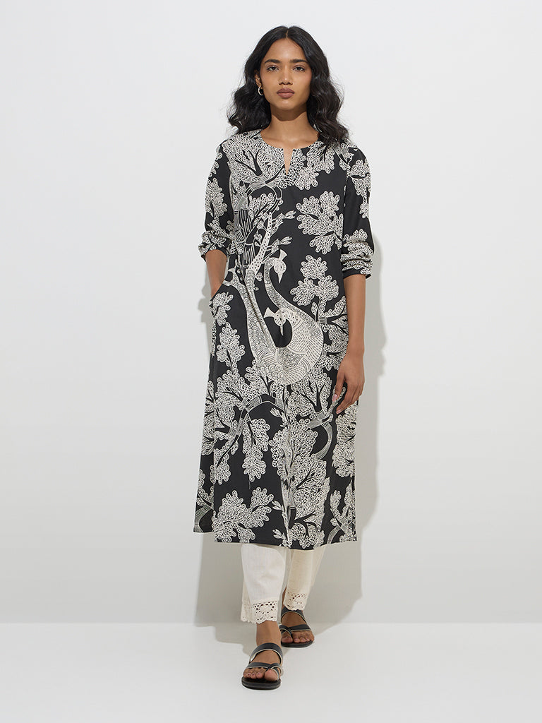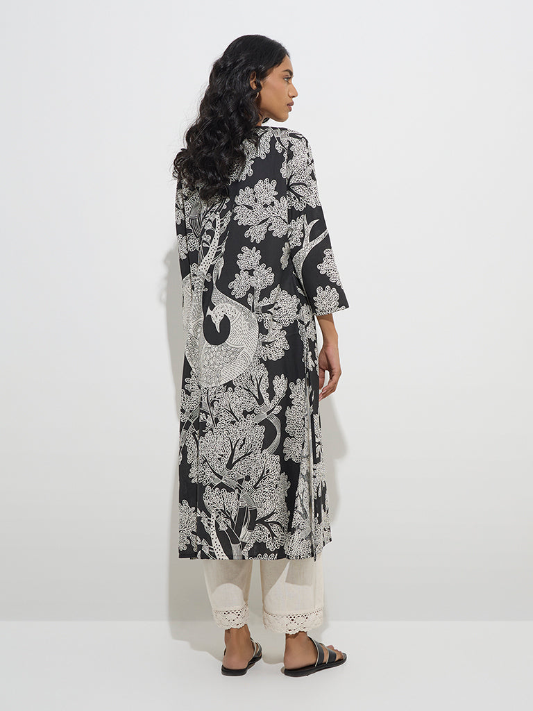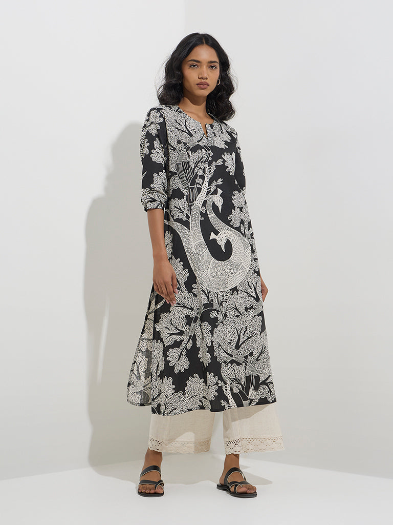 Utsa Black Gond-Inspired Cotton-Blend A-Line Kurta