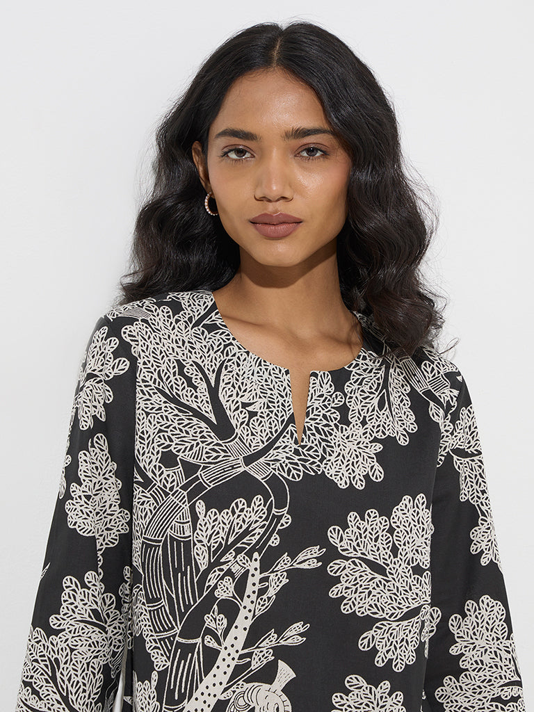 Shaped in an A-line structure. this black kurta from Utsa is woven from a sumptuous blend of cotton and linen for ultimate comfort. Showcasing striking Gond prints. it is styled with a split neck and three-quarter sleeves for a refined yet relaxed appeal.