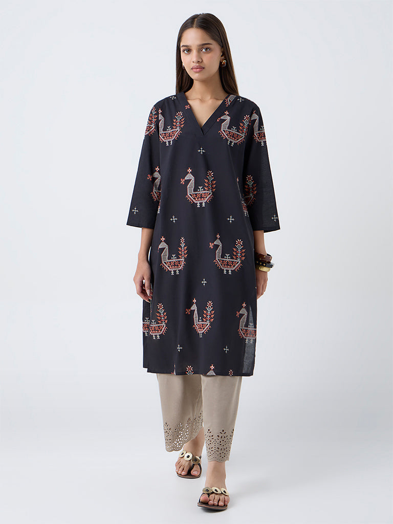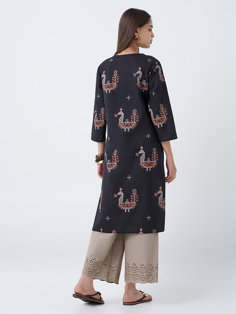 Utsa Black Peacock Printed Cotton Straight Kurta
