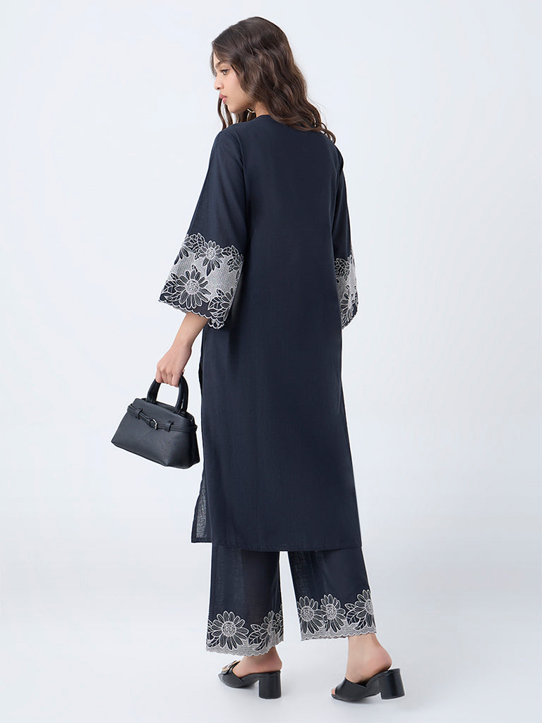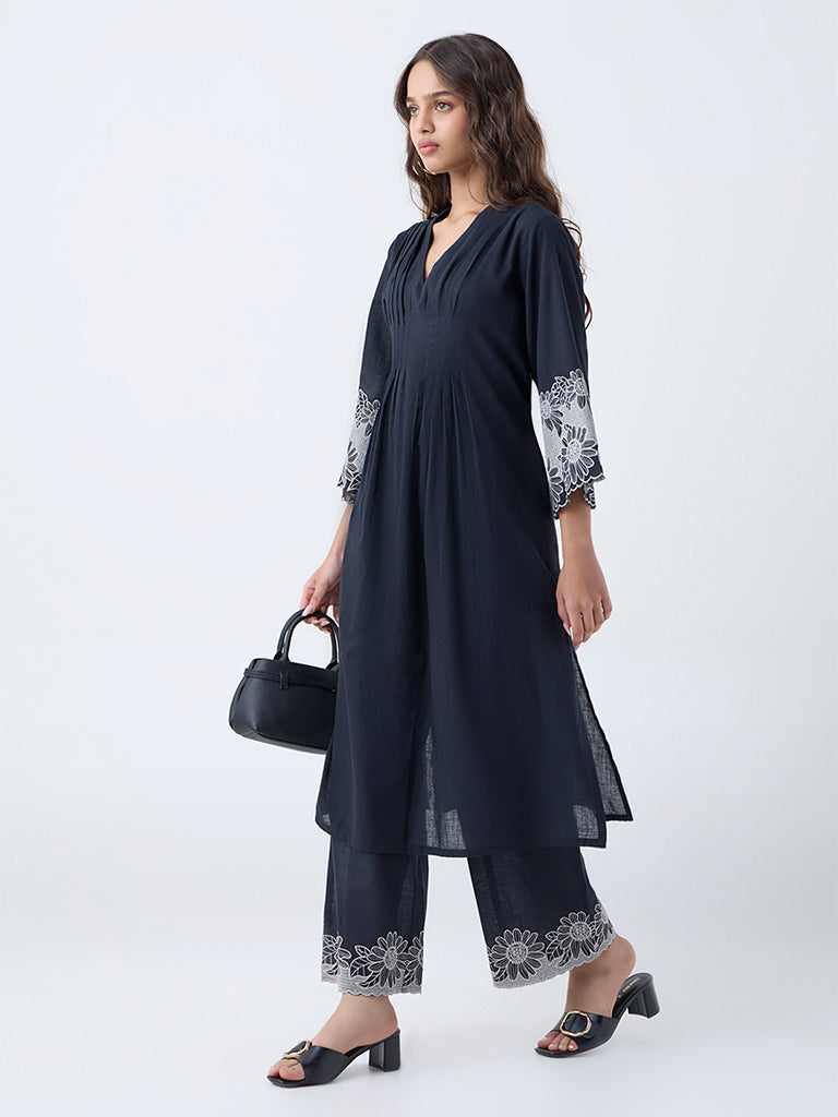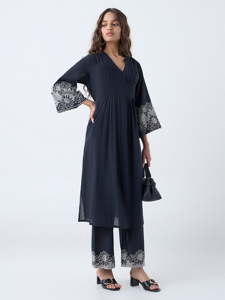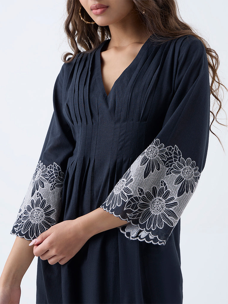 Bring subtle sophistication to your wardrobe with this black A-line kurta from Utsa. Featuring pintuck detailing on the bodice. a V-neck. and three-quarter sleeves finished with floral-embroidered cuffs. it blends classic design with elegant accents for a refined. versatile look.
