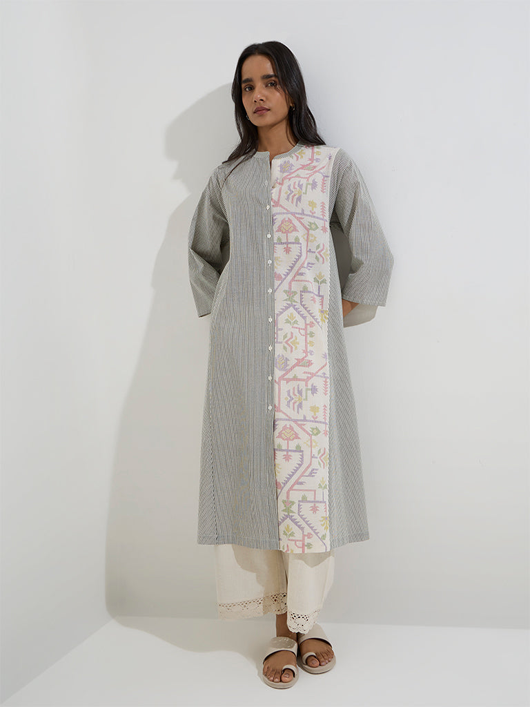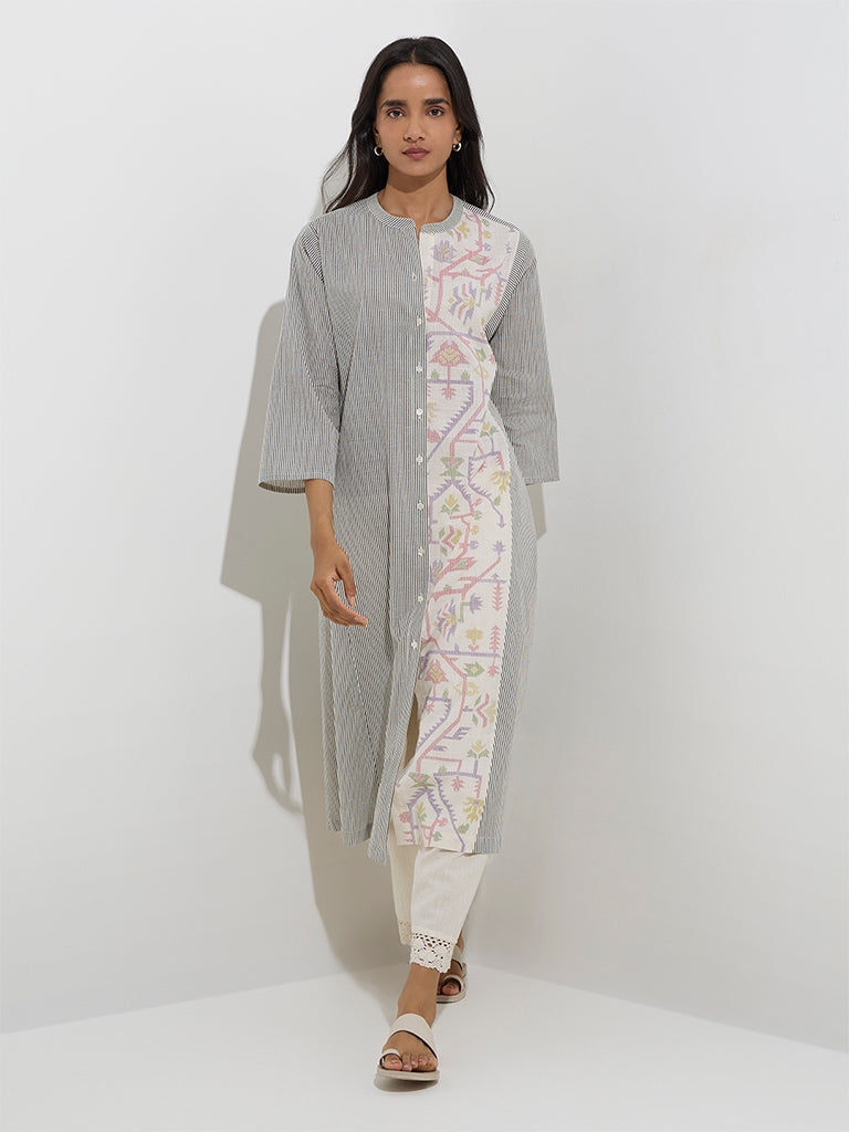 Utsa launches this black A-line kurta adorned with stripe patterns and elevated by a contrasting Jamdani-printed panel for a refined appeal. Woven from a cotton-rich fabric. it features a band-neck collar that extends into a button-up front and is finished with three-quarter sleeves.