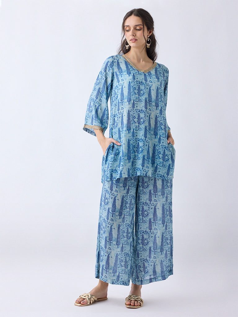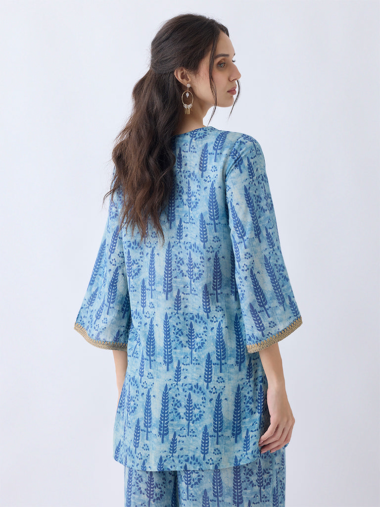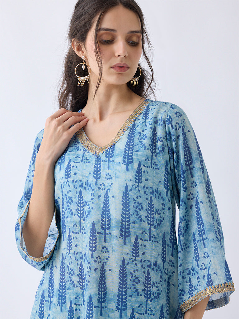 Utsa brings this blue kurti. structured in an straight silhouette from a lightweight fabric. Showcasing botanical patterns. it is framed with a V-neck with embellished embroidery and three-quarter sleeves. This versatile piece transitions seamlessly between everyday wear and ethnic occasions.