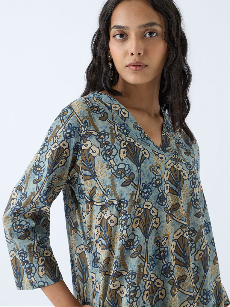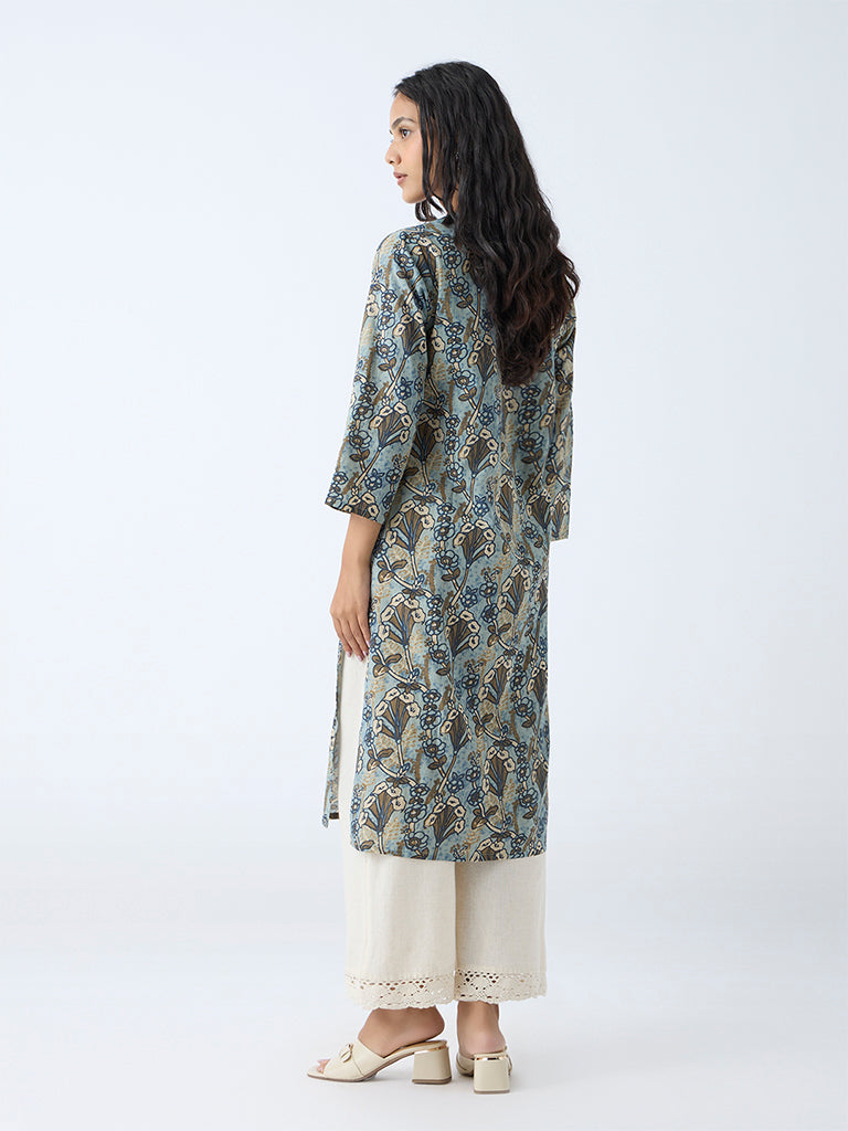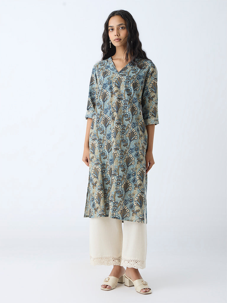 Give your ethnic style a complete makeover with this blue kurta from Utsa. decked with graceful floral prints for a touch of feminine charm. Designed with a flattering V-neck. three-quarter sleeves. and a discreet slip pocket. it offers the perfect balance of timeless style and day-long comfort.