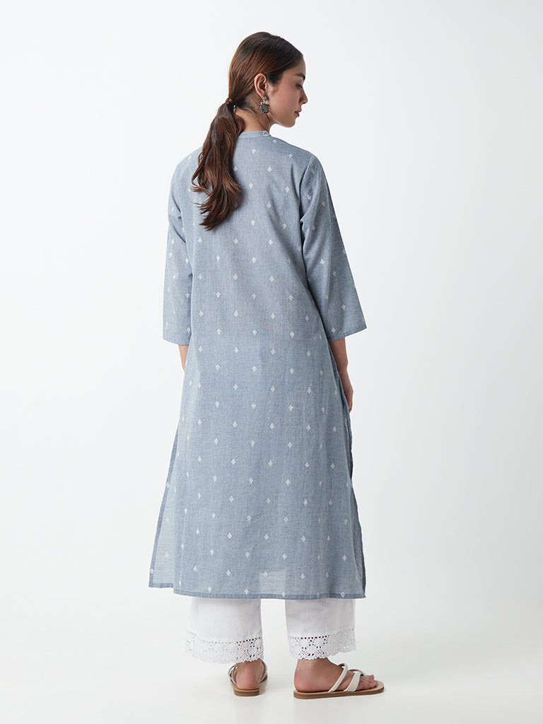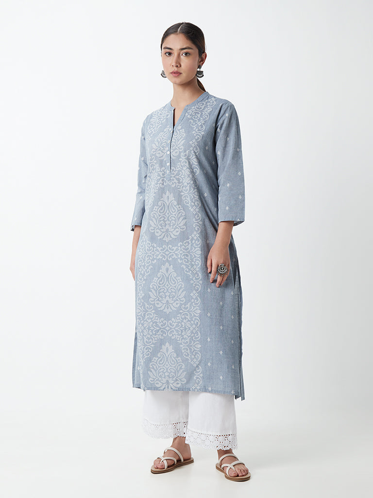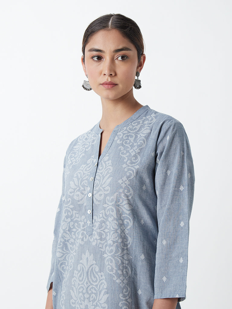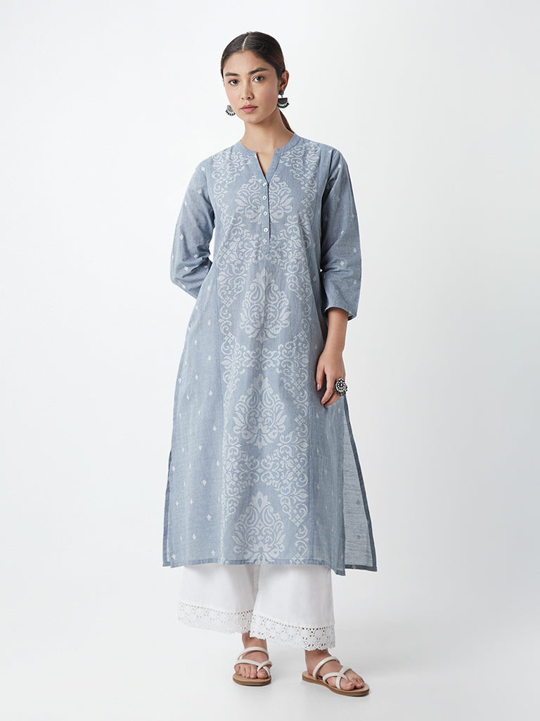 This blue kurta from Utsa exudes undeniable beauty and is a worthy investment. The elegant separate is carved into an A-line shape with floral designs running down the front for a refreshing touch. while the buttoned placket and slip pocket renders a practical bonus.