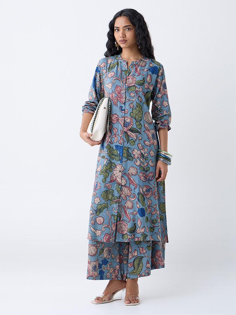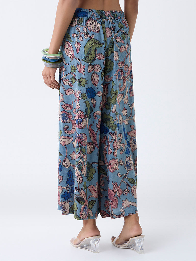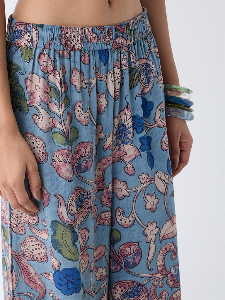 Add a refreshing touch to your ethnic wardrobe with these blue pants from Utsa. Adorned with a floral print. they feature a smooth elastic waistband and adjustable drawstrings for a comfortable fit. Easy to pair with kurtas or tunics. they make a versatile choice for everyday wear.