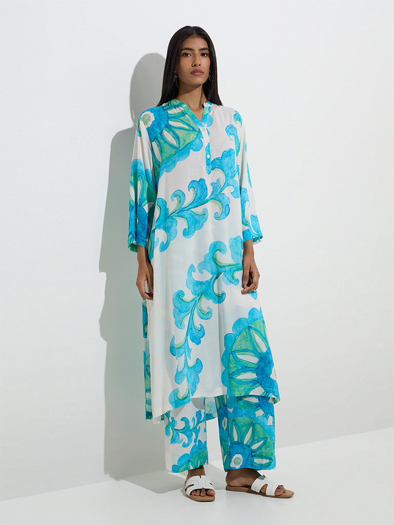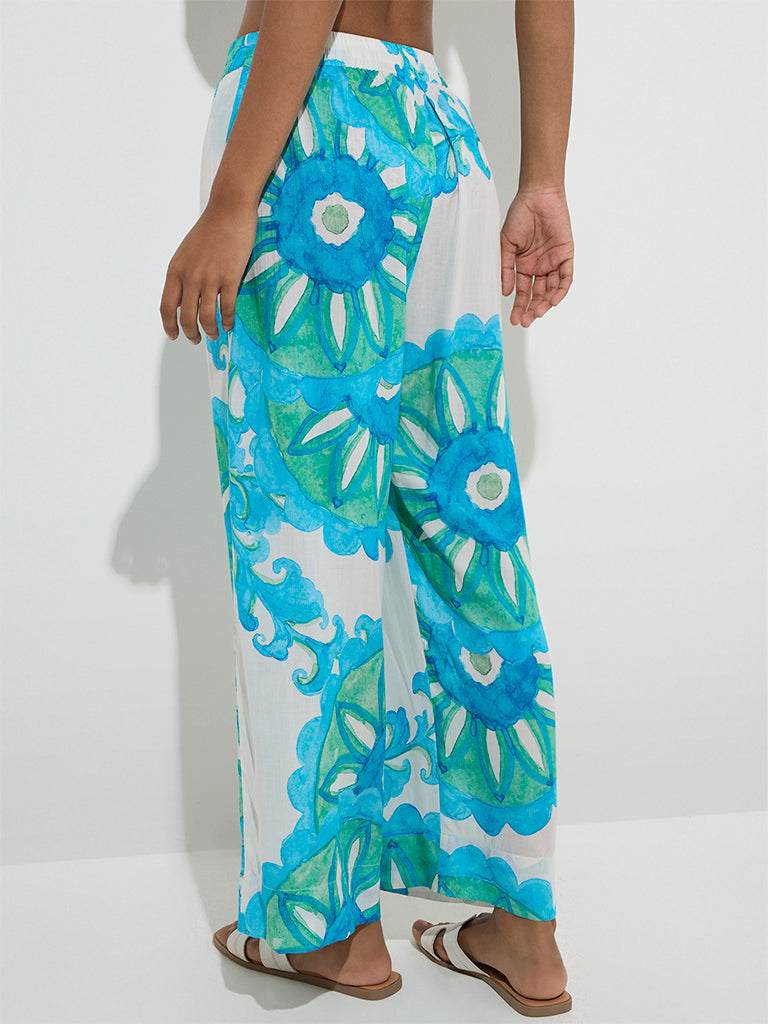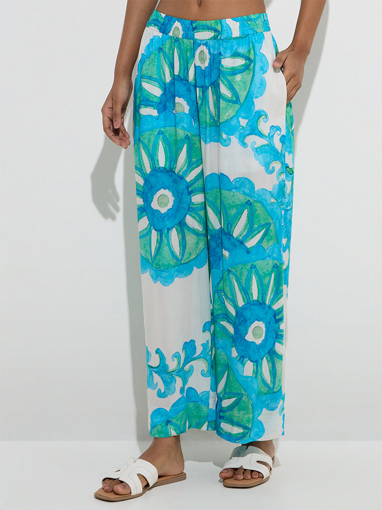 These blue ethnic pants from Utsa showcase a refreshing foliage print for a vibrant touch. Constructed from a premium fabric. they feature an elasticated waistband with adjustable drawstrings for a customizable fit.