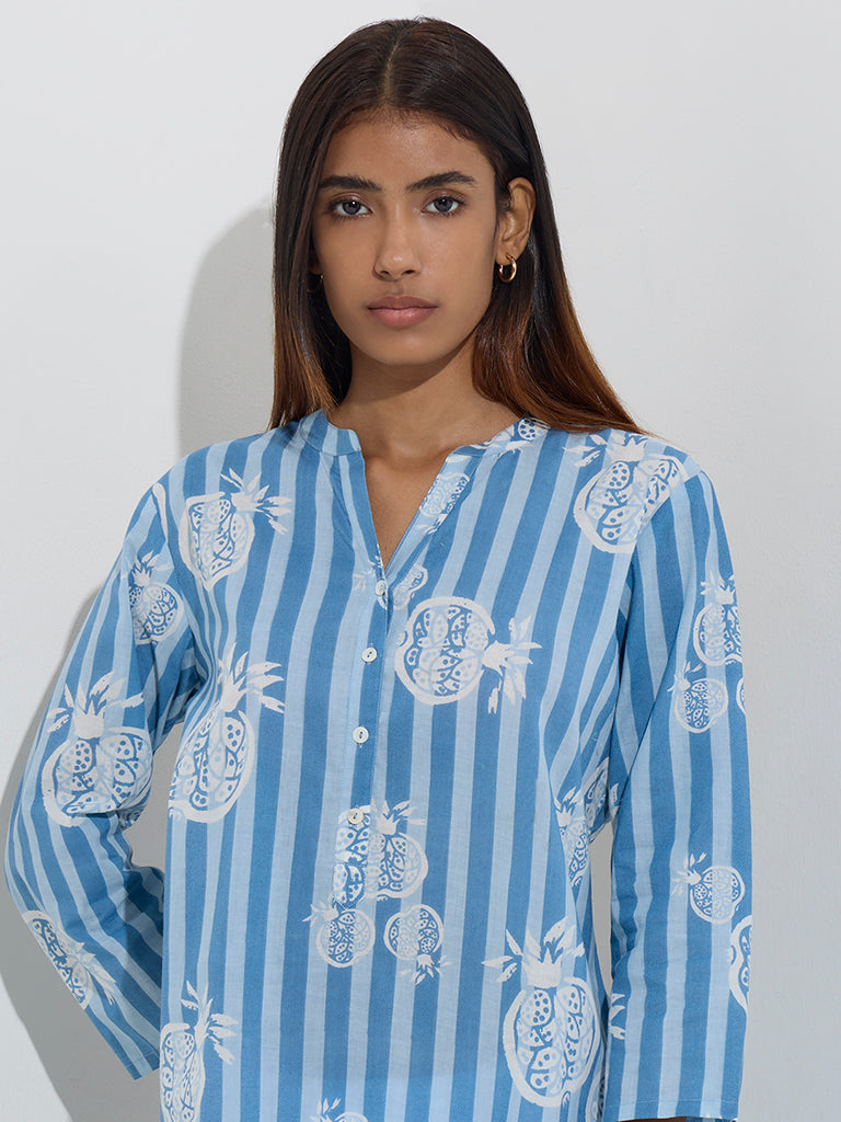 This blue kurta from Utsa is adorned with classic stripes and playful pomegranate motifs. Crafted from pure cotton in a straight silhouette. it features a mandarin neckline leading to a button placket and three-fourth sleeves. The slip pocket adds a functional bonus.
