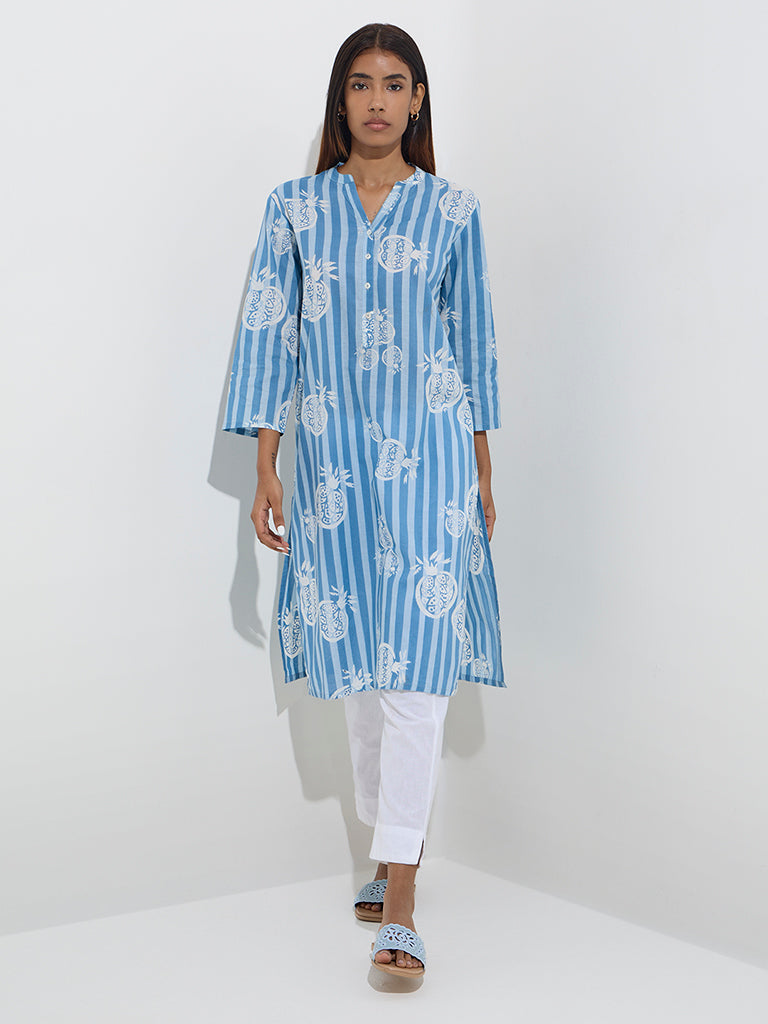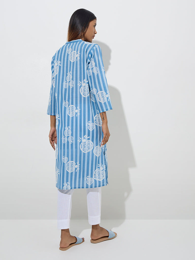 Utsa Blue Fruit Patterned Straight Cotton Kurta