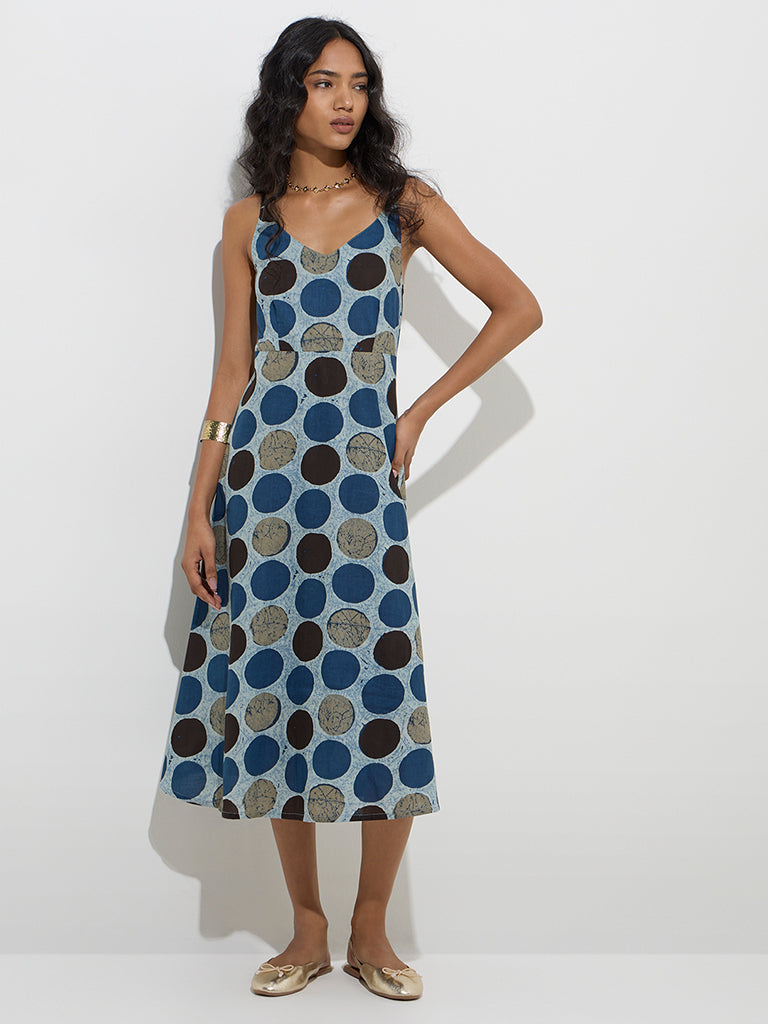 Utsa Blue Geometric Design Cotton A-Line Dress