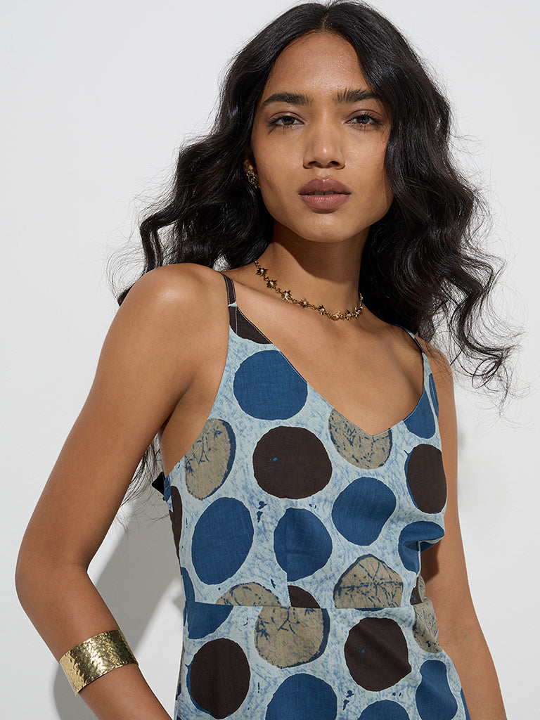 This blue dress from Utsa stands out with its eye-catching geometric patterns and breezy. everyday charm. Woven from pure cotton fabric. it is shaped in a flattering A-line silhouette and features a V-neck. adjustable straps. and a smocked back for ease and comfort. The look is thoughtfully finished with functional pockets for added convenience.