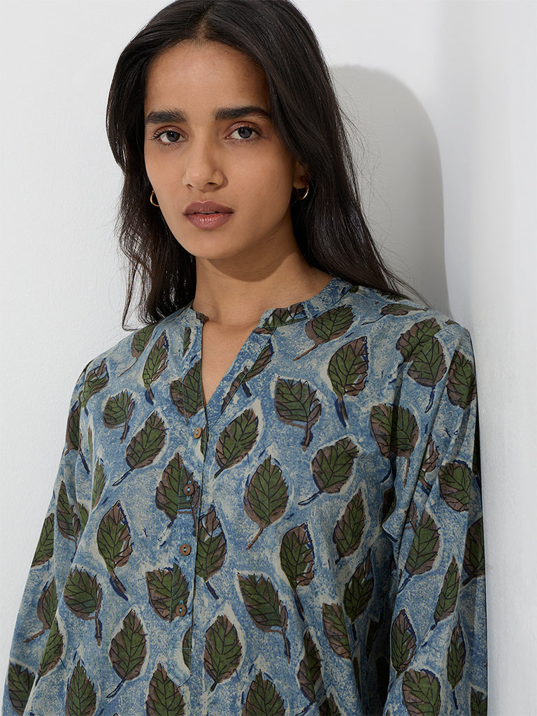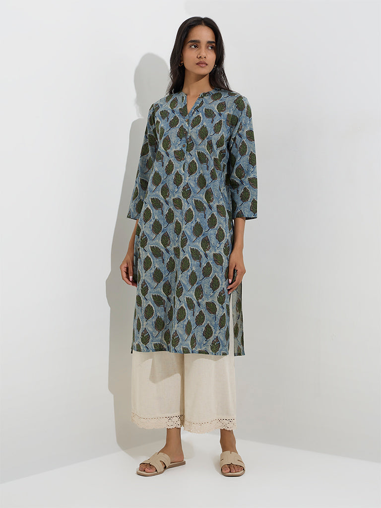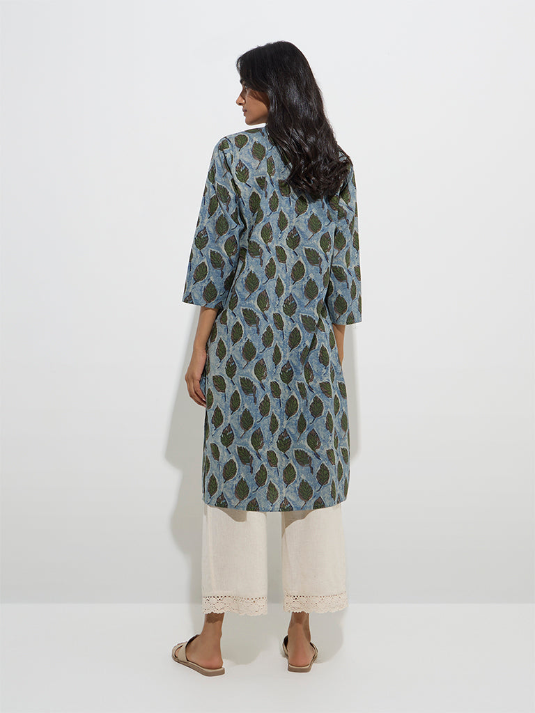 Utsa Blue Leaf Design Straight Cotton Kurta
