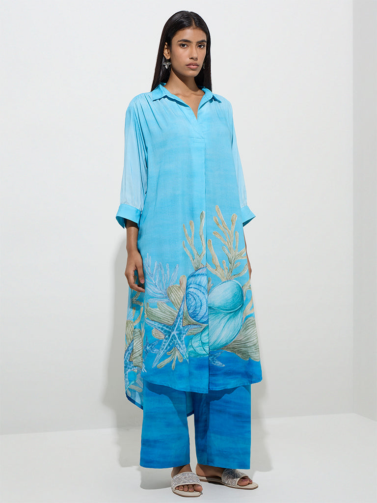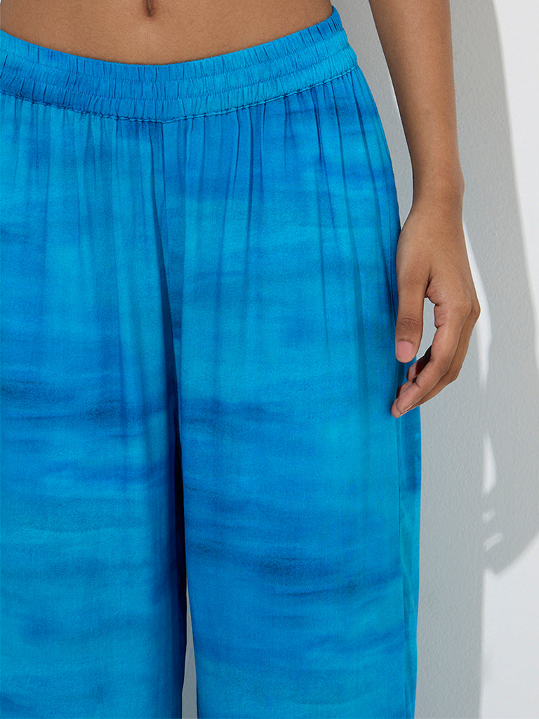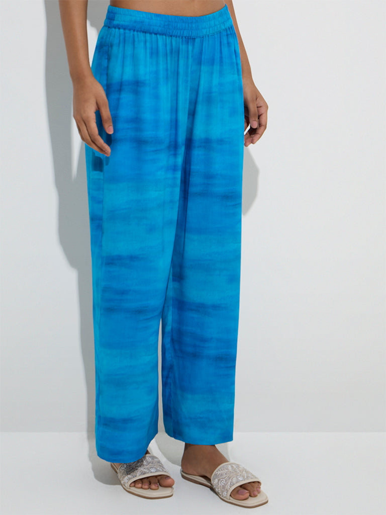 These blue palazzos from Utsa are adorned with a tie-dye pattern. adding a contemporary edge to your wardrobe. Created from a lightweight fabric. they are fitted with an elasticated waistband and adjustable drawstrings for a personalized fit.