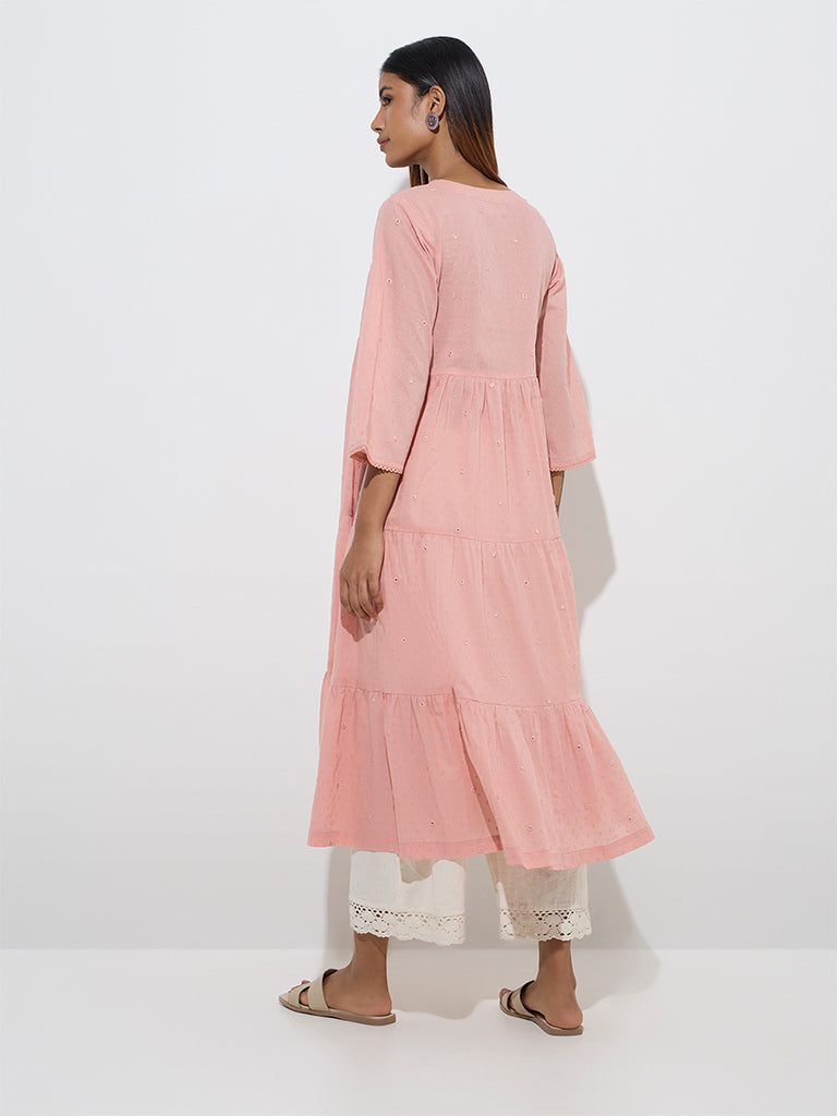 This blush pink kurta from Utsa showcases mirror detailing throughout. Made from pure-cotton in a flattering tiered frame. it includes a V-neck and three-quarters sleeves. The slip pocket renders practicality.