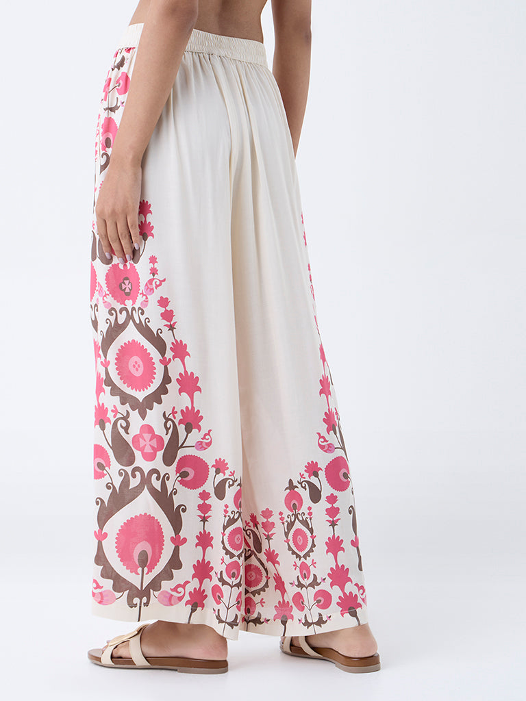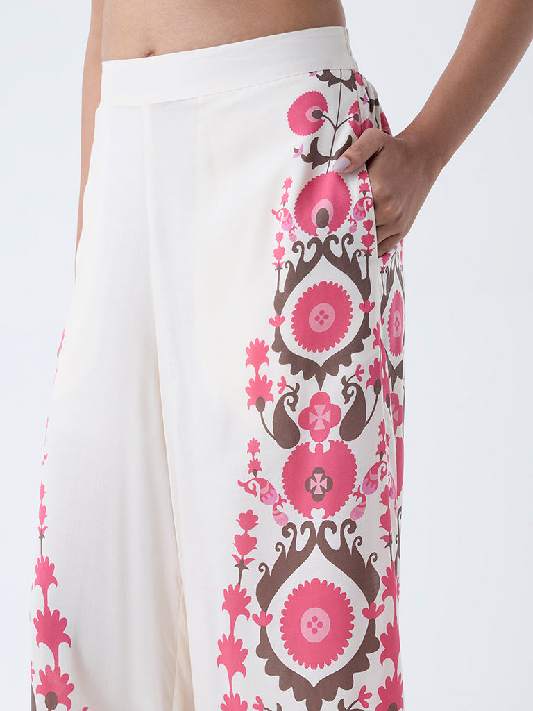These cream palazzos from Utsa bring contemporary finesse to everyday dressing with their eye-catching floral motifs. Spun from a super-soft fabric that drapes beautifully. the pair is designed with a smooth elastic waistband for a seamless fit and finished with side pockets for modern functionality.
