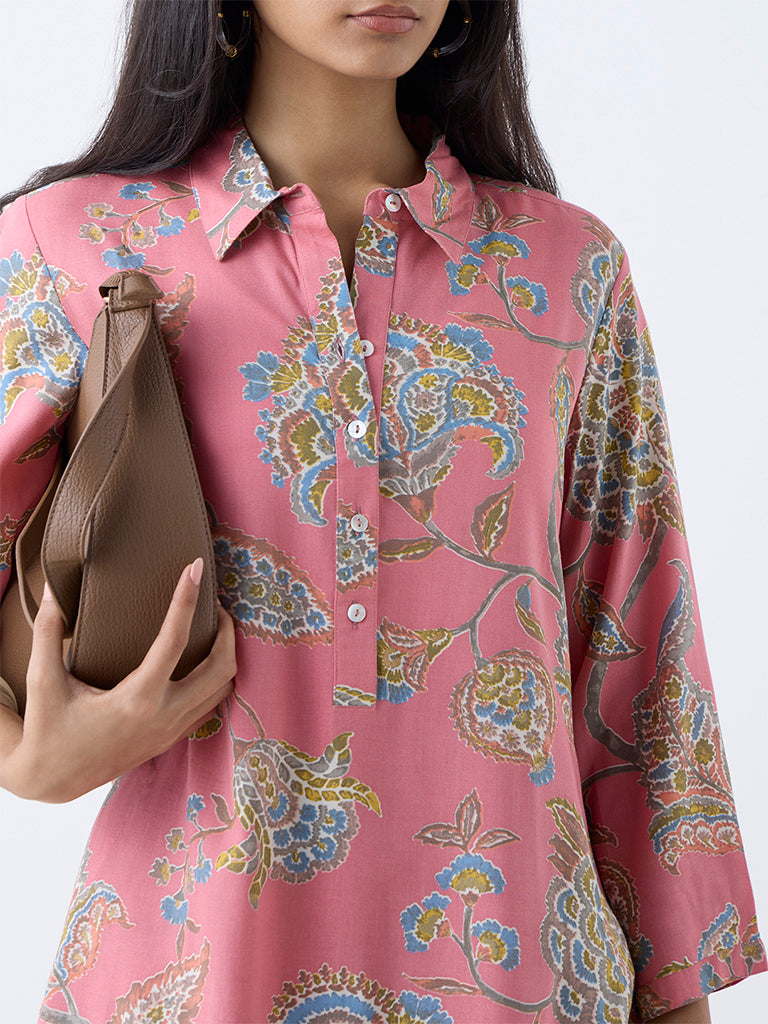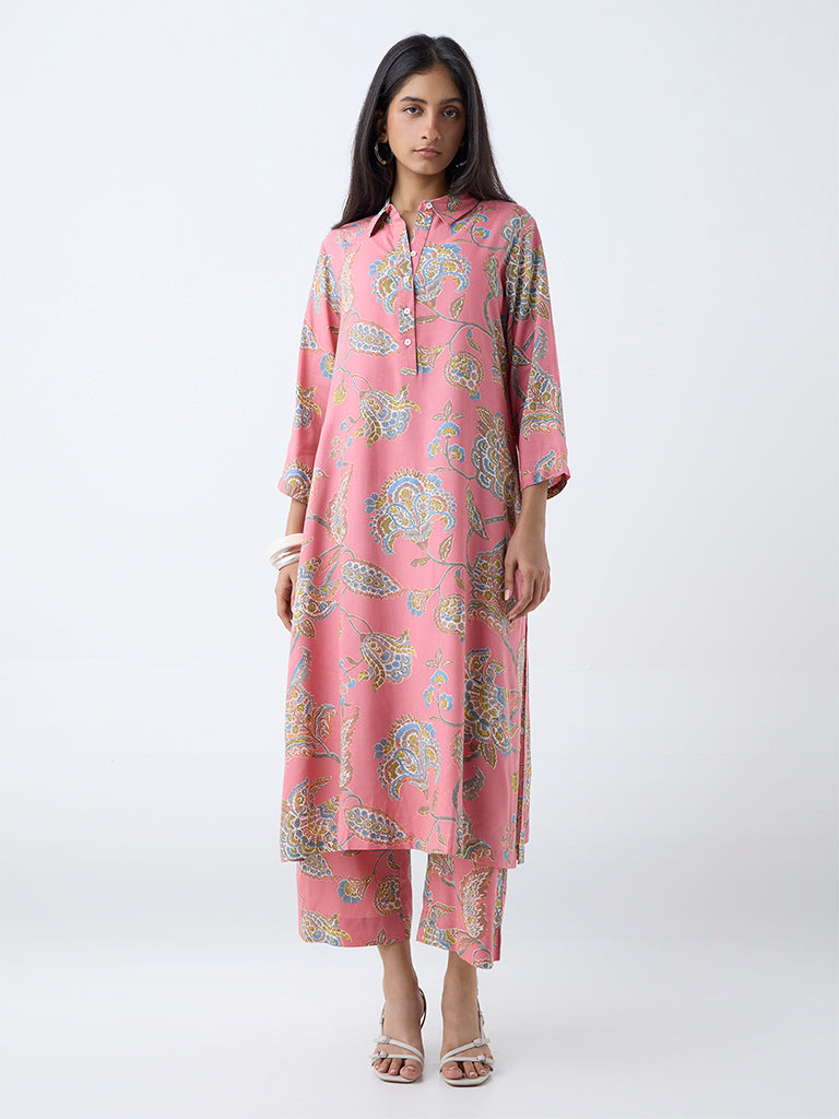 Breeze through weekends and casual gatherings in this dusty pink kurta by Utsa. Its A-line silhouette and lightweight fabric offer ease and comfort. while a botanical print adds feminine charm. Designed with a collar. short button placket. and three-quarter sleeves. it combines classic style with practicality. A discreet slip pocket completes the look.