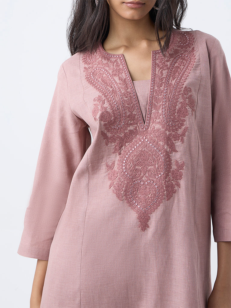 Utsa Dusty Pink Floral Embroidered A-Line Cotton Kurta