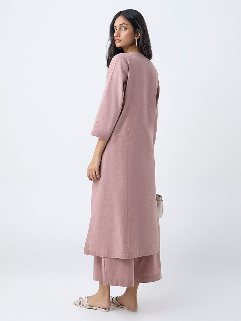 Utsa launches this dusty pink kurta carved in an A-line frame and enriched with floral embroidery on the yoke. Designed with a V-neck and full sleeves. it balances elegance with ease. Constructed from a cotton-rich fabric. this versatile piece transitions seamlessly from ethnic days to everyday wear.