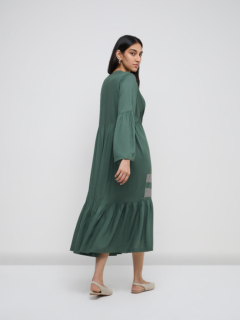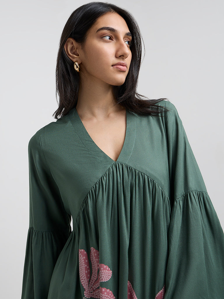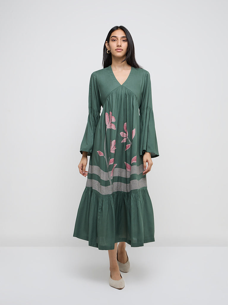 This green dress from Utsa spotlights bandhani floral designs. Cut in a tiered silhouette from a lightweight fabric. it includes a V-neck and flute sleeves.