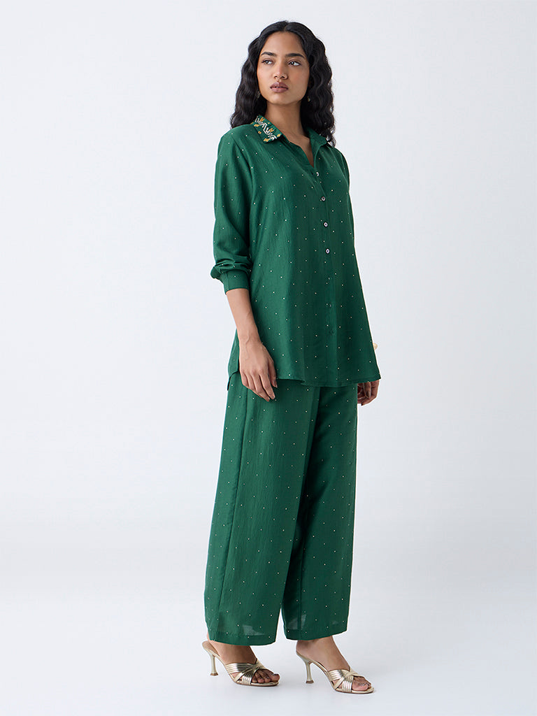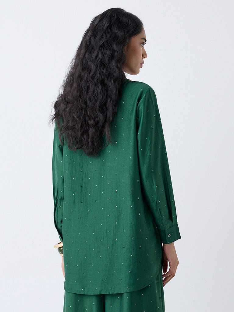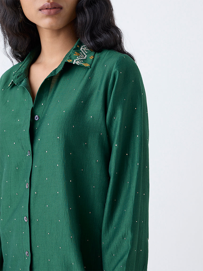 A refined addition to your wardrobe. this green ethnic tunic from Utsa is crafted from quality fabric for a polished finish. The spread collar is elevated with delicate embroidered detailing. while the button-down front and full sleeves keep it classic. Perfect for pairing with both ethnic pants and contemporary separates.