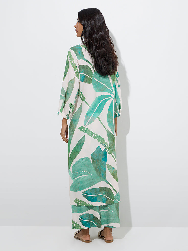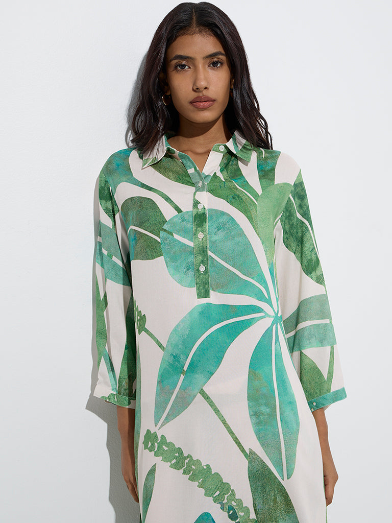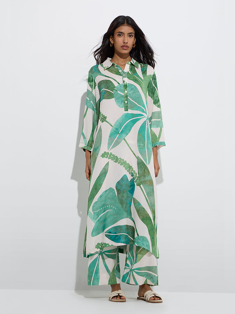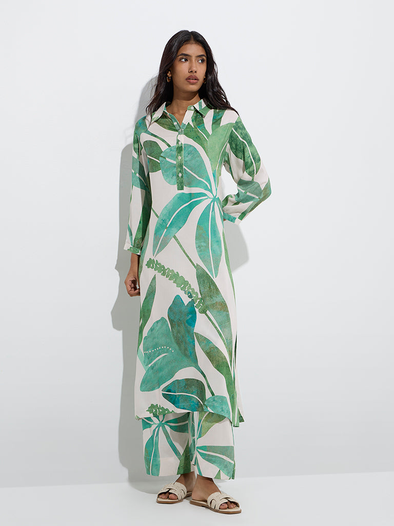 This green kurta from Utsa flaunts a refreshing foliage-inspired print that brings nature’s calm into your wardrobe. Created from a breathable fabric. its flattering A-line silhouette offers ease and movement. The collar flows into a neat button placket. complemented by full sleeves for a balanced look.