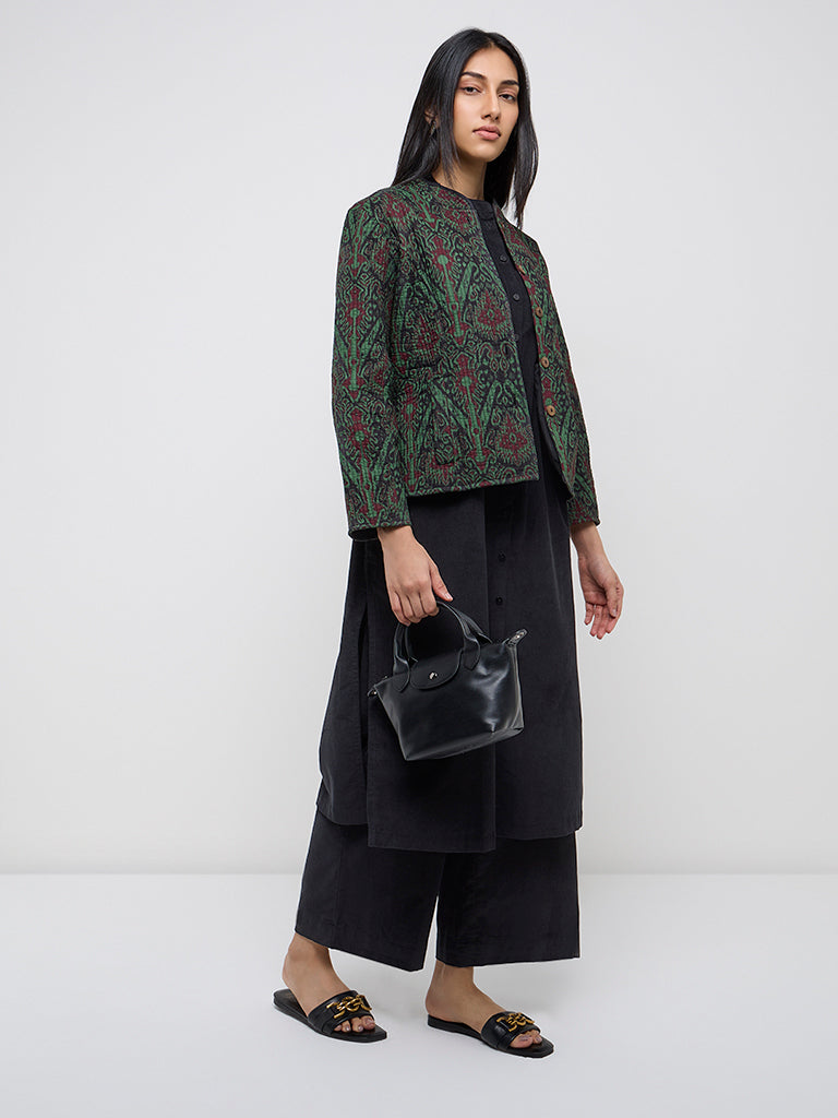 Adorned with traditional ikat prints. this green quilted jacket by Utsa will amplify your ethnic edit. Its pure-cotton composition ensures utmost comfort. while the button placket and full sleeves complete it.