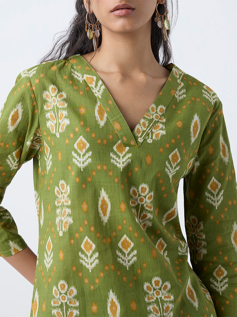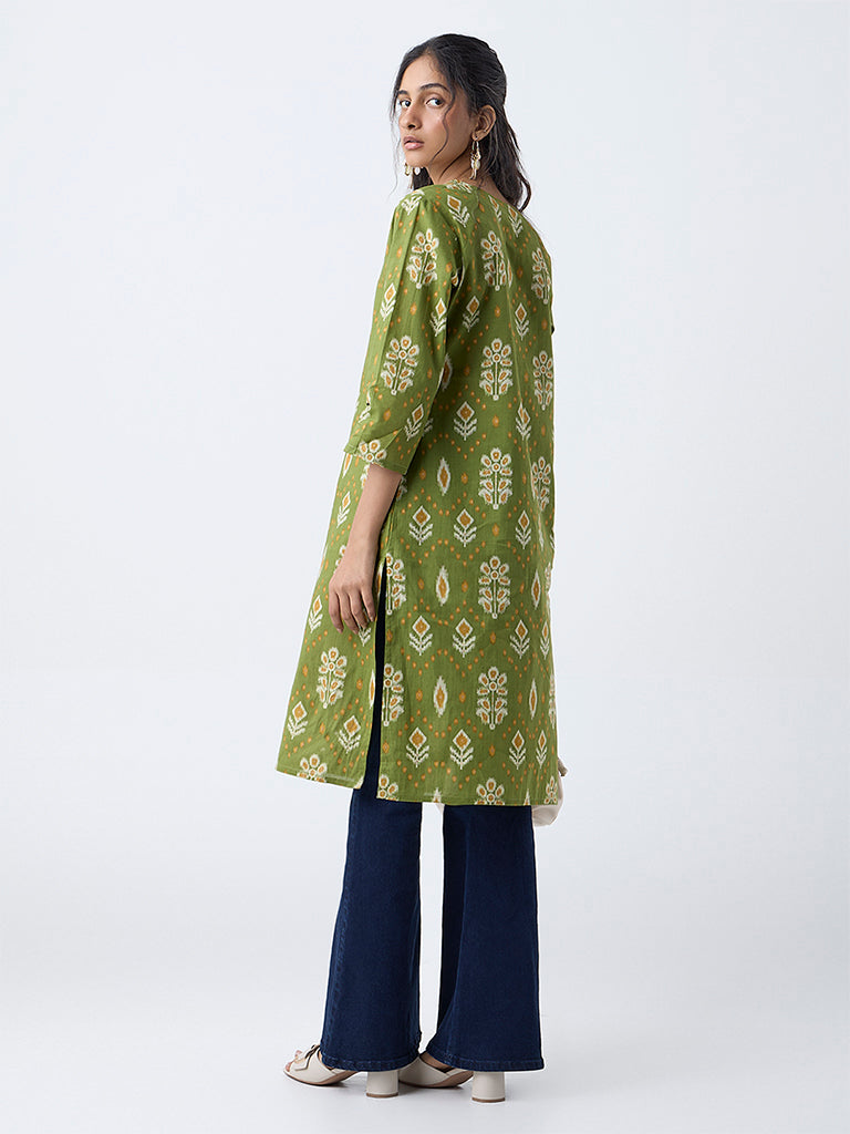 Utsa Green Ikat Pattern Straight Cotton Kurta