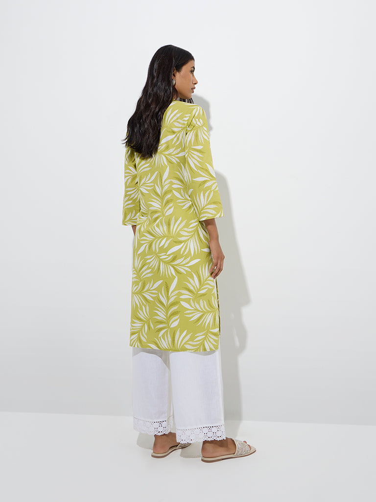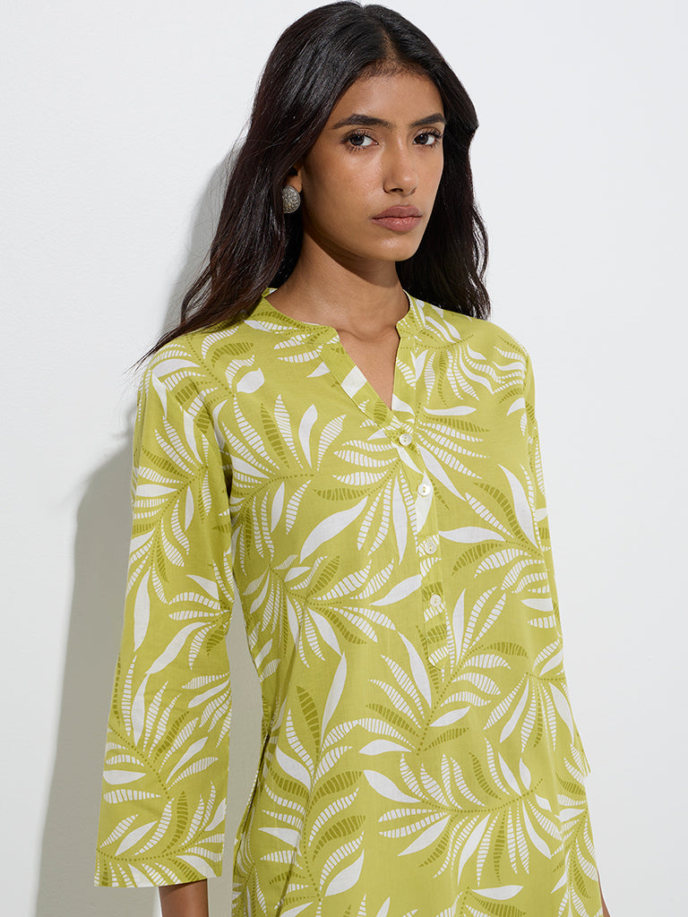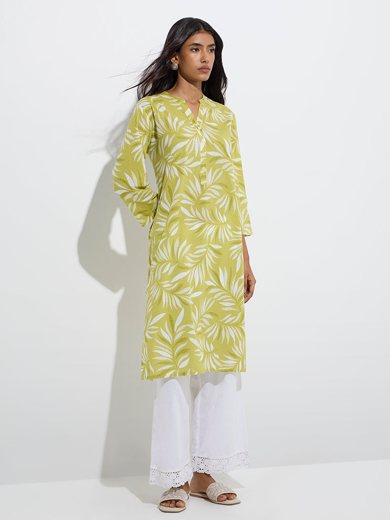 Utsa Green Leaf Printed Cotton Straight Kurta