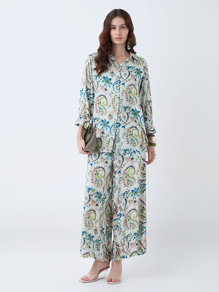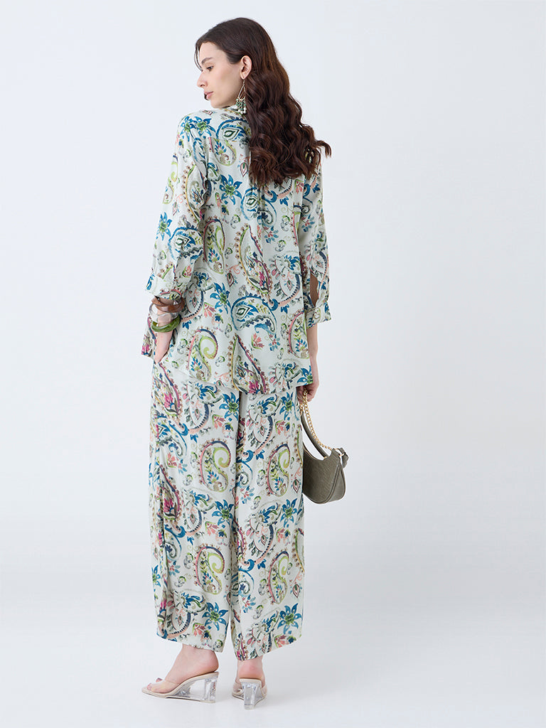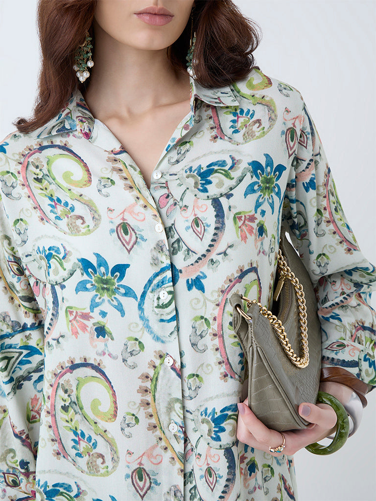 Revive your off-duty line-up with this green ethnic tunic from Utsa. Spun from a breathable fabric. it ensures all-day comfort. while the mix of floral and paisley prints adds a graceful charm to your look. Designed with a spread collar. button placket. and full sleeves. this shirt balances effortless style with a refined finish.