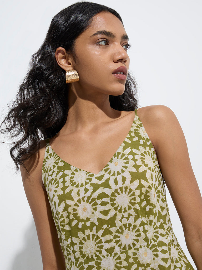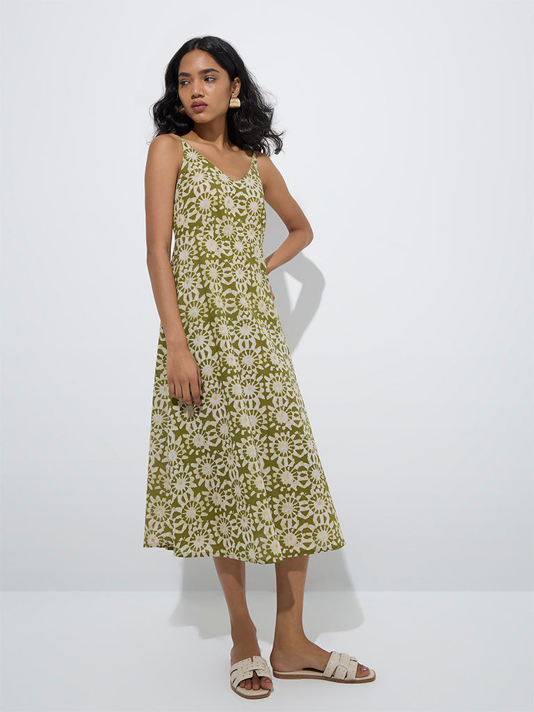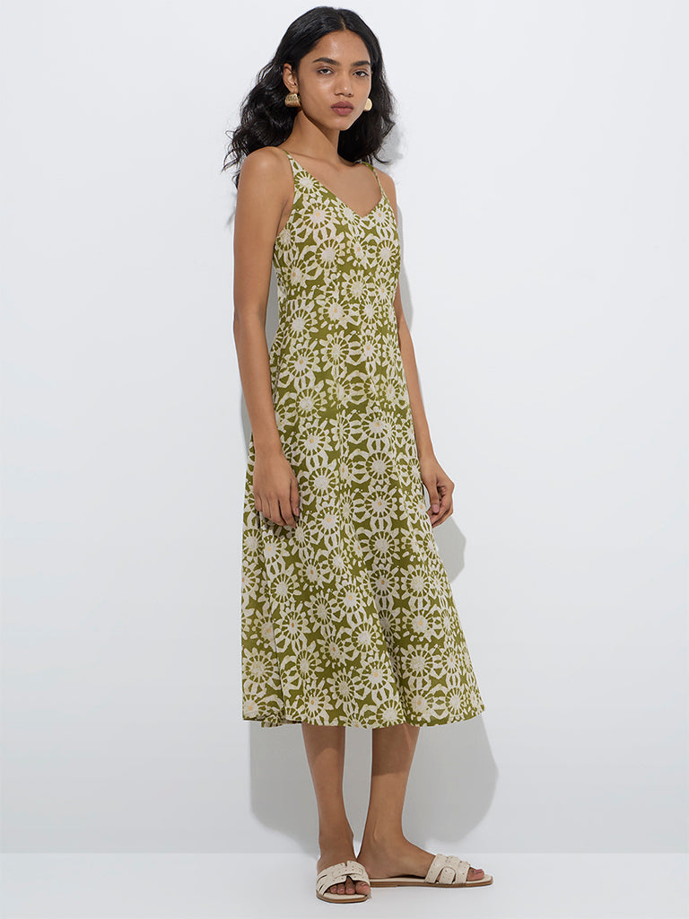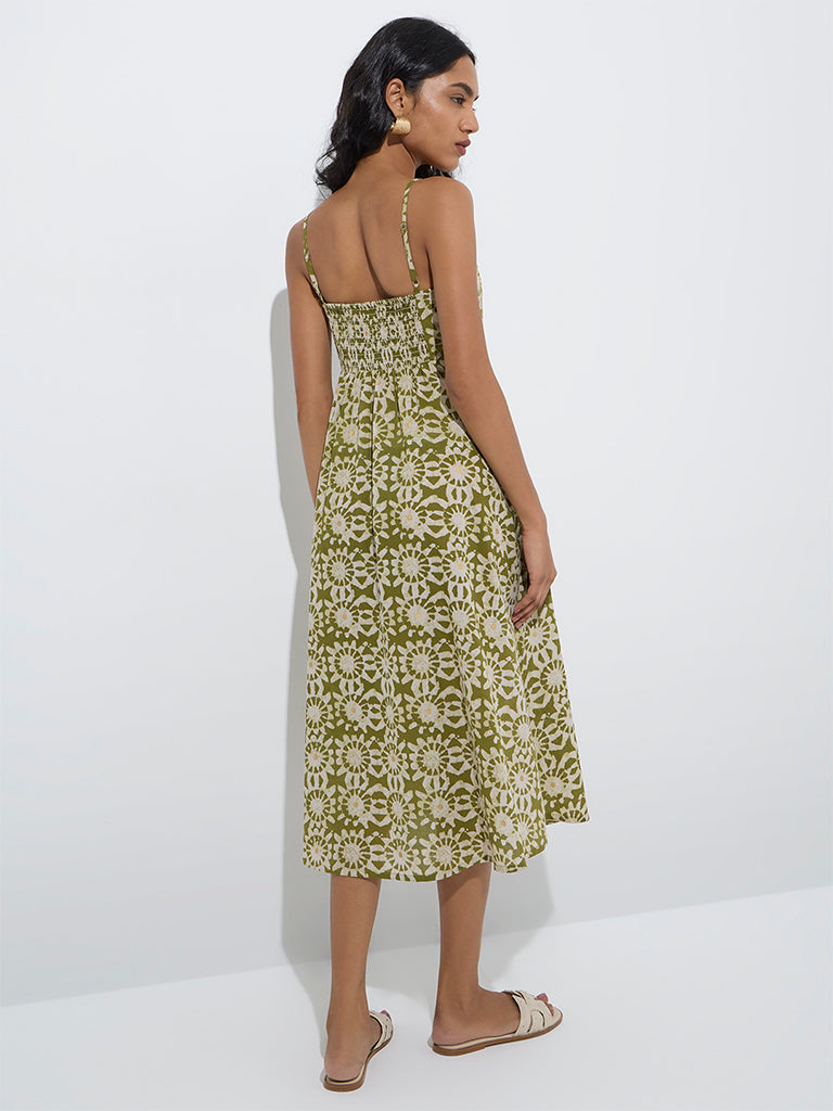Add a breezy touch to your wardrobe with this green A-line dress from Utsa. featuring playful prints. Crafted from pure cotton for all-day comfort. it comes with a flattering V-neck. adjustable shoulder straps. and a smocked back for a flexible fit. A convenient side pocket adds a practical finish to this easy-going style.